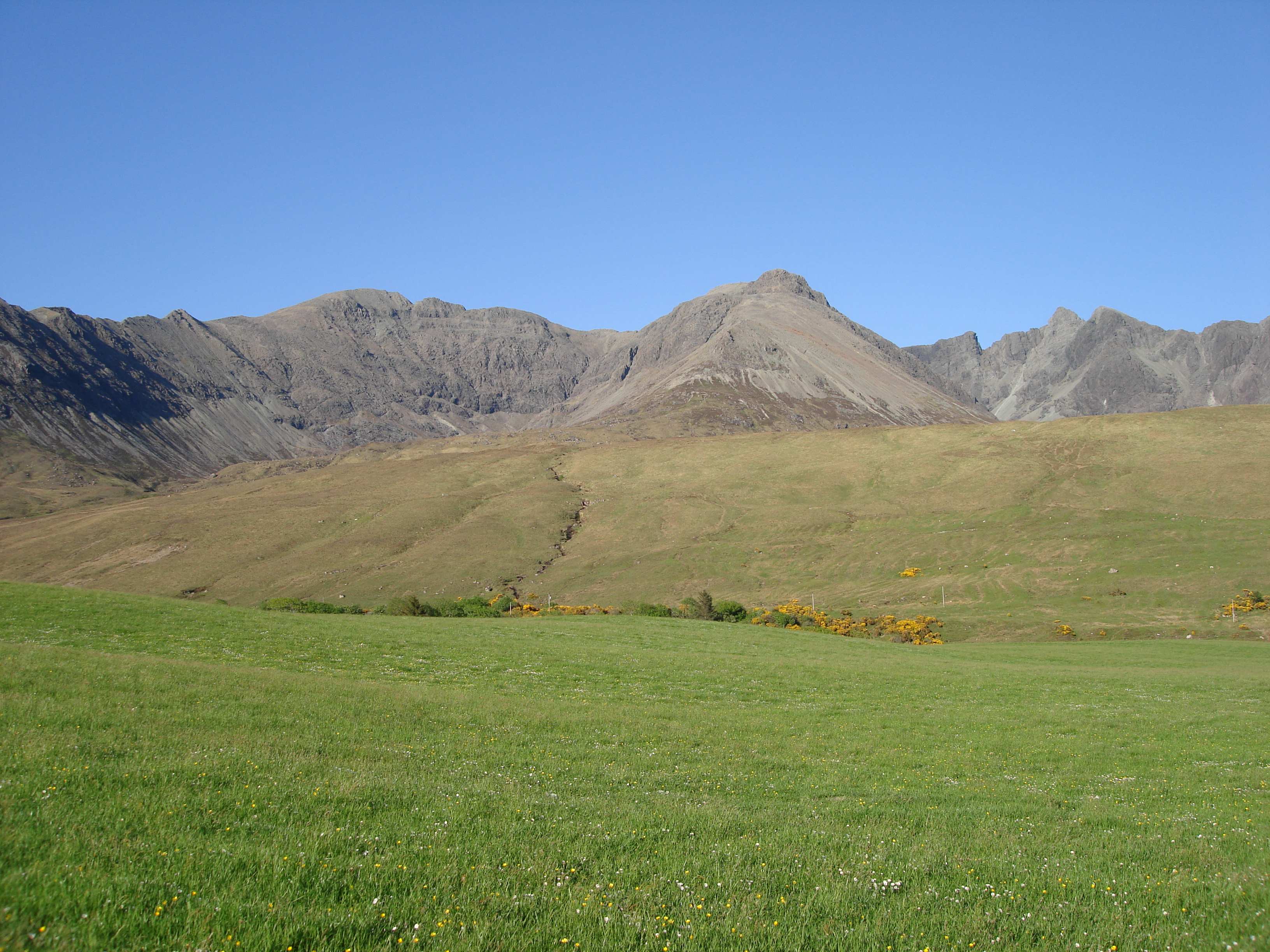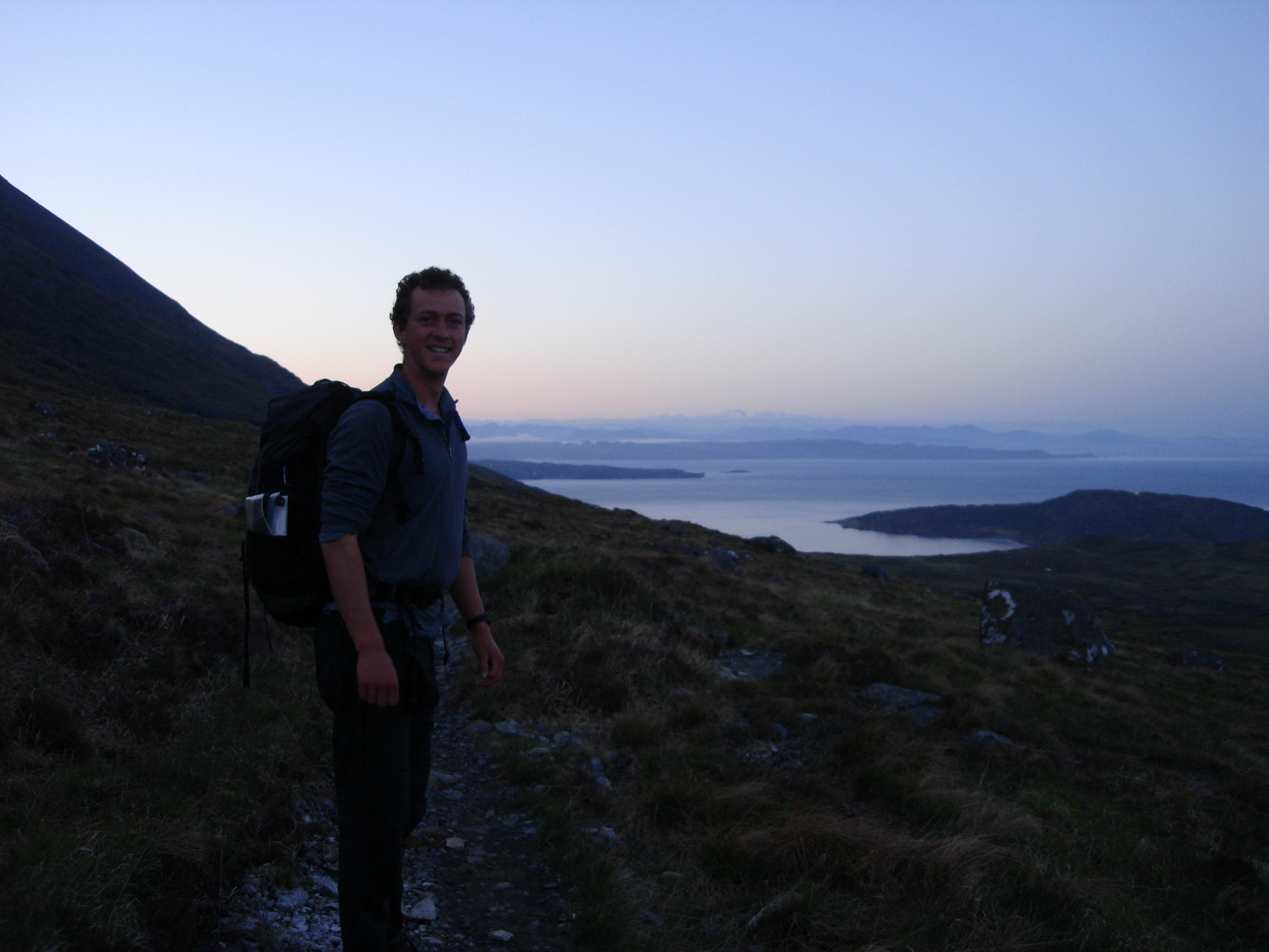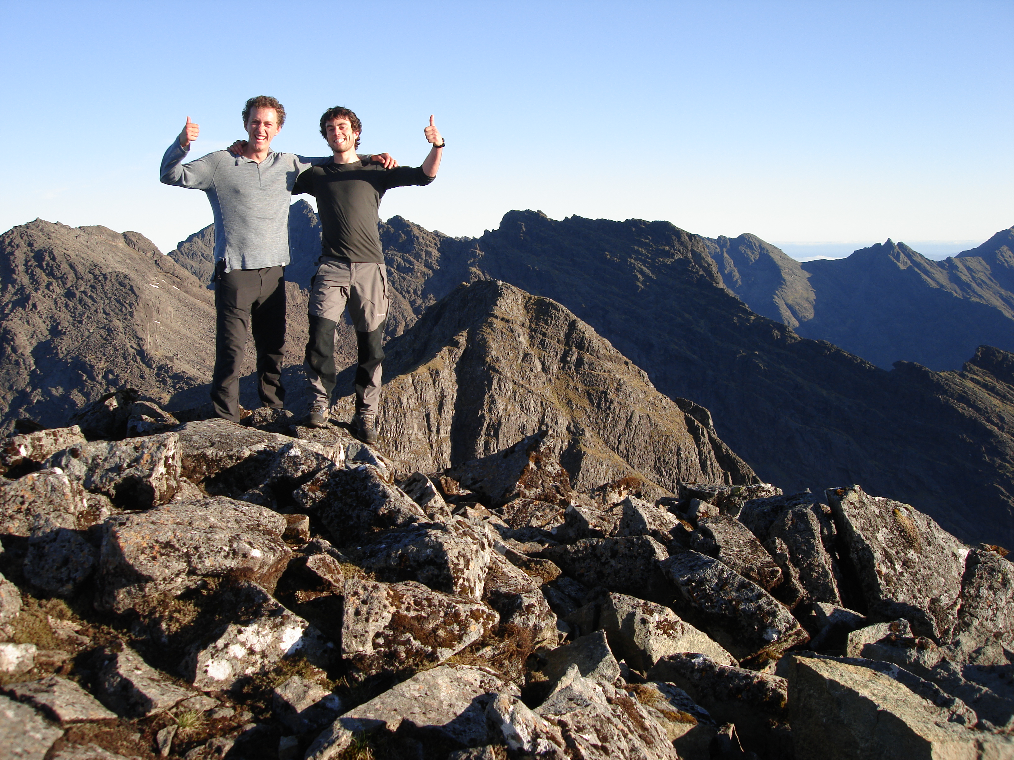 The approach to the ridge was a comfortable pace, slowed only by the thousands of wee stops. We drank at every stream crossing, hoping to be as hydrated as humanly possible as we hit the ridge-top desert. No worries though, every wee became more scenic than the last as the sun began to creep over the horizon, and the panorama of the sea and the Western Isles spread further and further around us as we climbed. We reached the ridge crest at 5.30am, and were glad to drop our packs. The out and back from Bealach a Garbh Choire to Gars Bheinn appealed more than the moorland shlep round to its scree-covered flanks. We moved quickly once free of our bags, and arrived at the summit of Gars Bheinn in just under an hour. One timer photo later, and the ridge traverse had started.