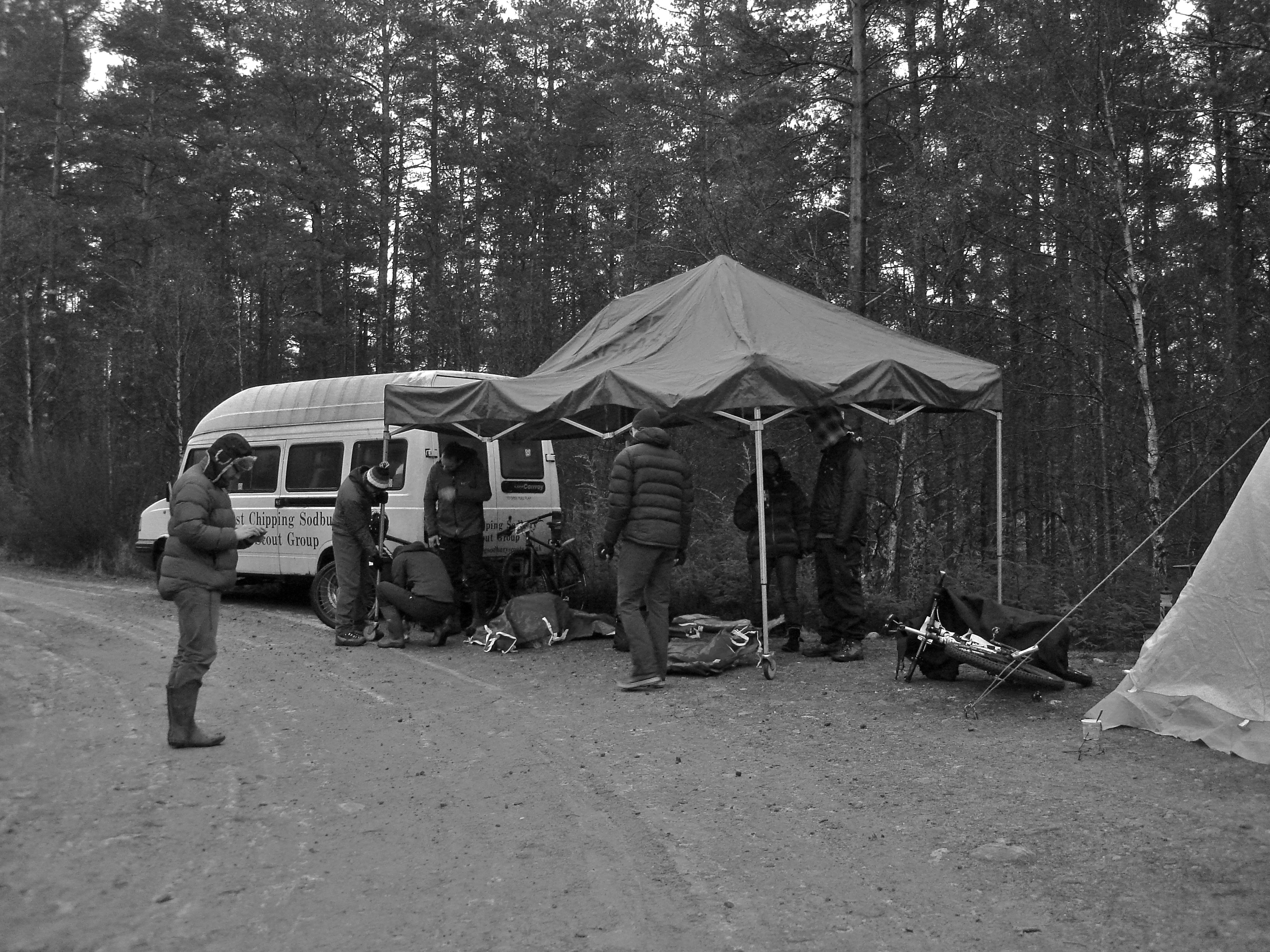 Last year the Puffer was significant, too, because it came just a week after two friends were among the four people killed in an Avalanche in Glencoe. In the turbulence that followed news of the avalanche the ‘Puffer became a bit of a focal point, and some last-minute fundraising ultimately raised a shade over £20,000 for the Mountain Rescue teams that responded. A lot has been said about Chris and Busty’s attitudes towards adventures in the year that’s followed – this blog is named after map-scouring sessions looking for hidden gems with Chris – and as this year’s ‘Puffer coincided with the anniversary of the avalanche it seemed a much better option than moping. Team BikeVillage was named ‘Bustin’ your Bell End’ (geddit, thanks Addy), and on Friday evening me, Tom, Addy and imported French talent Sam convened at team HQ in a misty and mostly ice-free highland forest.