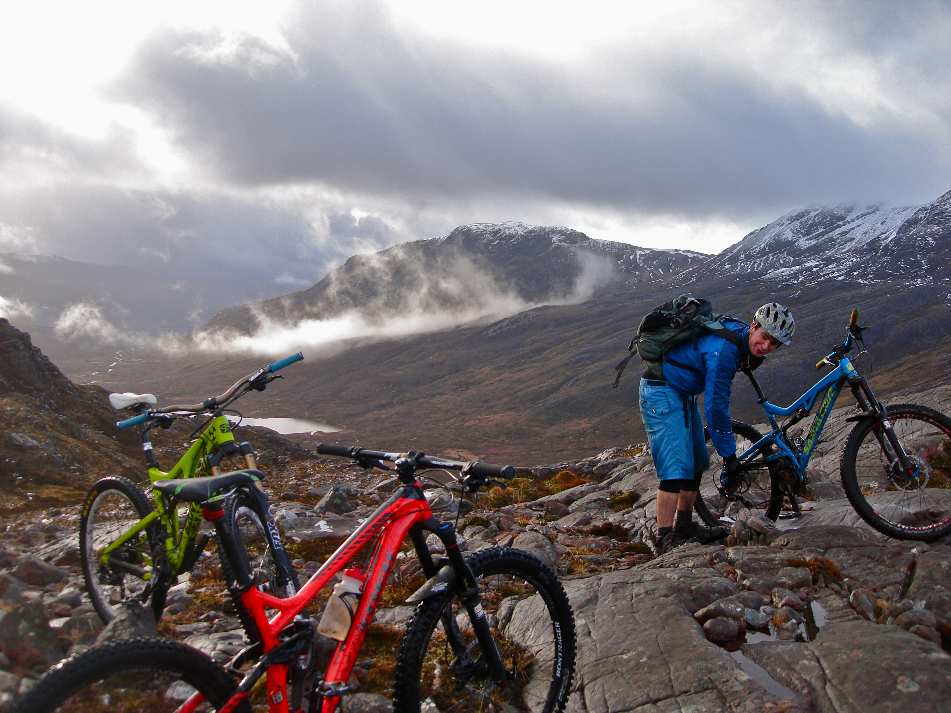 The Annat climb is surely the best in Scotland, if not the UK as a whole. Come on, find me a better one, I’ll believe it when I see it. Several kilometres of beautifully technical climbing on slabs and set stone steps, leading upwards to Loch an Eion. We reached the first bealach in good time, reminded of the season by the chill wind as we climbed again to Bealach Bán and hit the snowline. Ascending even further to the third and final bealach, the upper reaches of Coire Lair beckoned on the other side. The snow became deep: sometimes firm enough to ride, but more often swallowing your wheels when you least expected it, seeming to scold you for forgetting the silliness of taking bikes here in winter.
