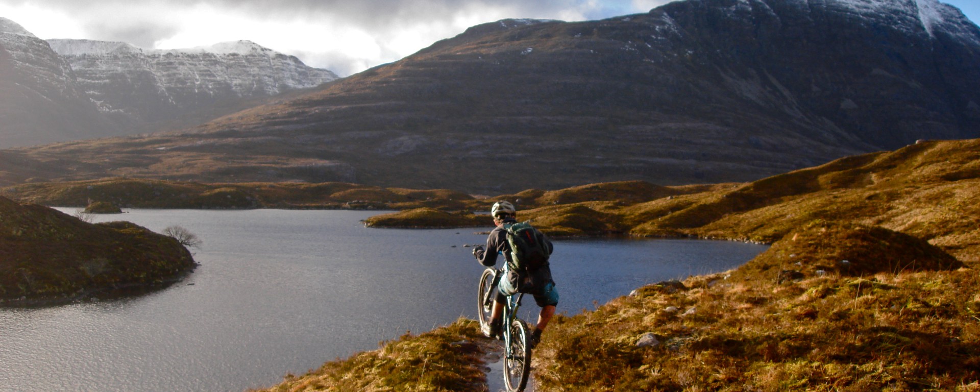 Pausing only to get the elusive clean shot at riding the bridge over the Fionn Abhainn, we continued to move quickly upwards and into Coire Fionnaraich. The contrast with the higher trails we had ridden earlier was marked: jackets off and the first bare-armed ride of the year as the sunshine contained a palpable warmth. It was a struggle to draw ourselves away from the charm and peace of the bothy, but after a final bite to eat it was time to hit the trail and broach the final bealach, rejoining our steps from earlier in the day and anticipating the flow of the morning’s climbing when ridden in the opposite direction. The descent to Annat delivered, and as we left the snow and wind behind the sun began to set, and we were reminded that the early start wasn’t over-keen after all. Golden light added to the high-speed slabs and snow-tipped peaks, and suddenly the soggy bum and numb feet were forgotten. All I could hear was the constant, deadened thud of the tyres as they floated over rock, and the burning of well-used legs wasn’t enough to intrude on the need to crank faster towards the sea.