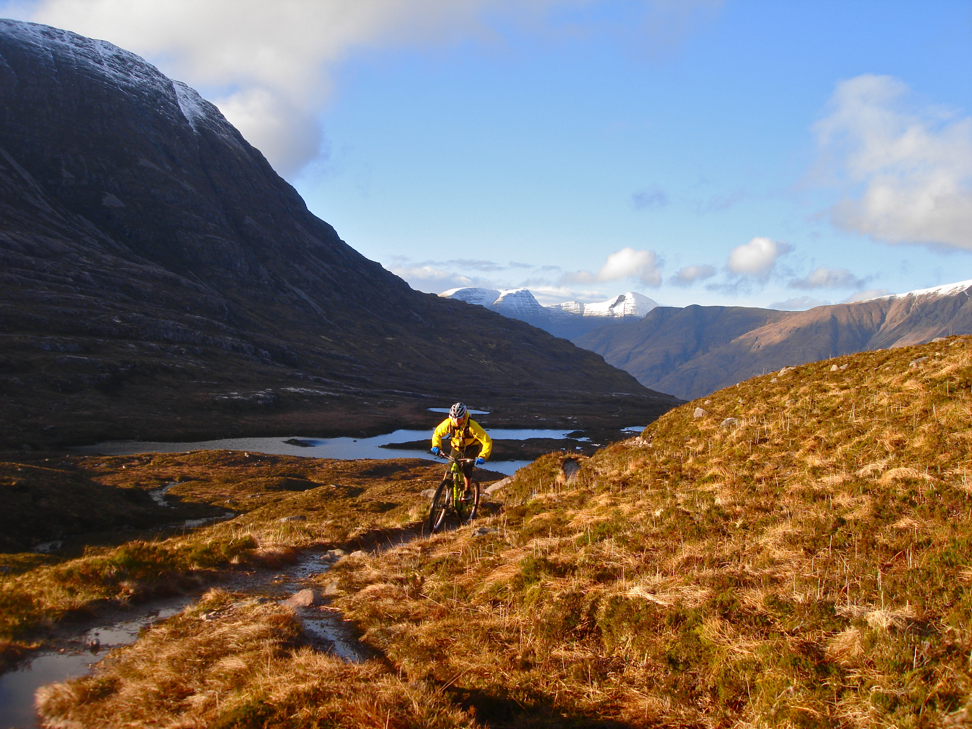 We reached Coire Lair at 1130, again in good time given the conditions, but we didn’t stay long in the snow-filled wind funnel. Obligatory photos taken, we surfed the snow that had drifted over the trail at the head of the coire. With gravity on our side, the success rate of riding the snow out improved sharply, and the blank white surface was a mile away from the ball-pit of fist-sized quartzite rocks that normally carpets the descent. To match the lofty status of the Annat climb, the ludicrously fun Achnashellach descent gave some symmetry to the ride, and we were virtually at the Strathcarron road before we noticed the transition to warm sunshine that marked our crossing to the hills’ south-facing slopes. A bite of lunch in the layby, and then the spin down the road to Coulags and the start of another stellar technical singletrack climb.