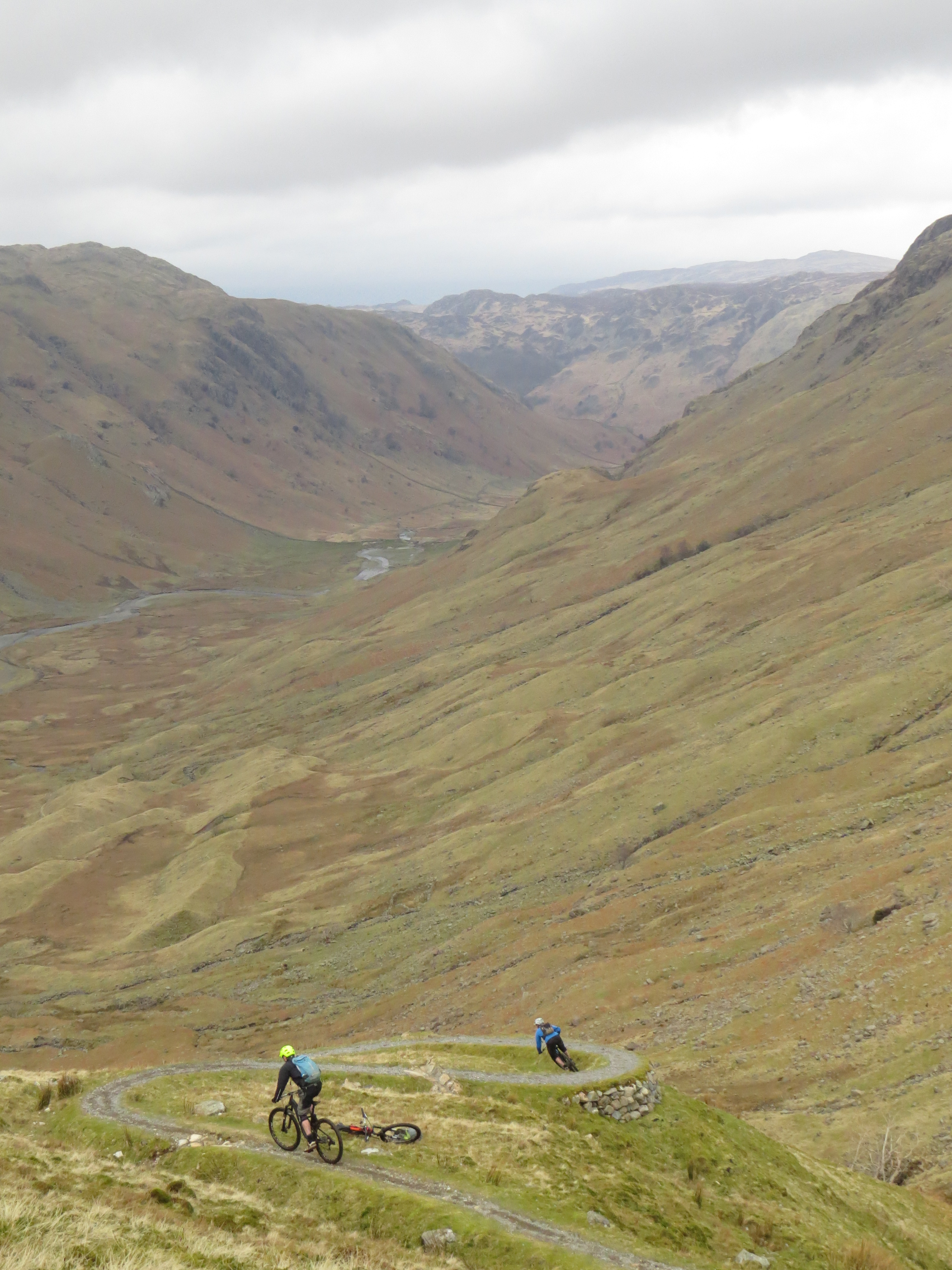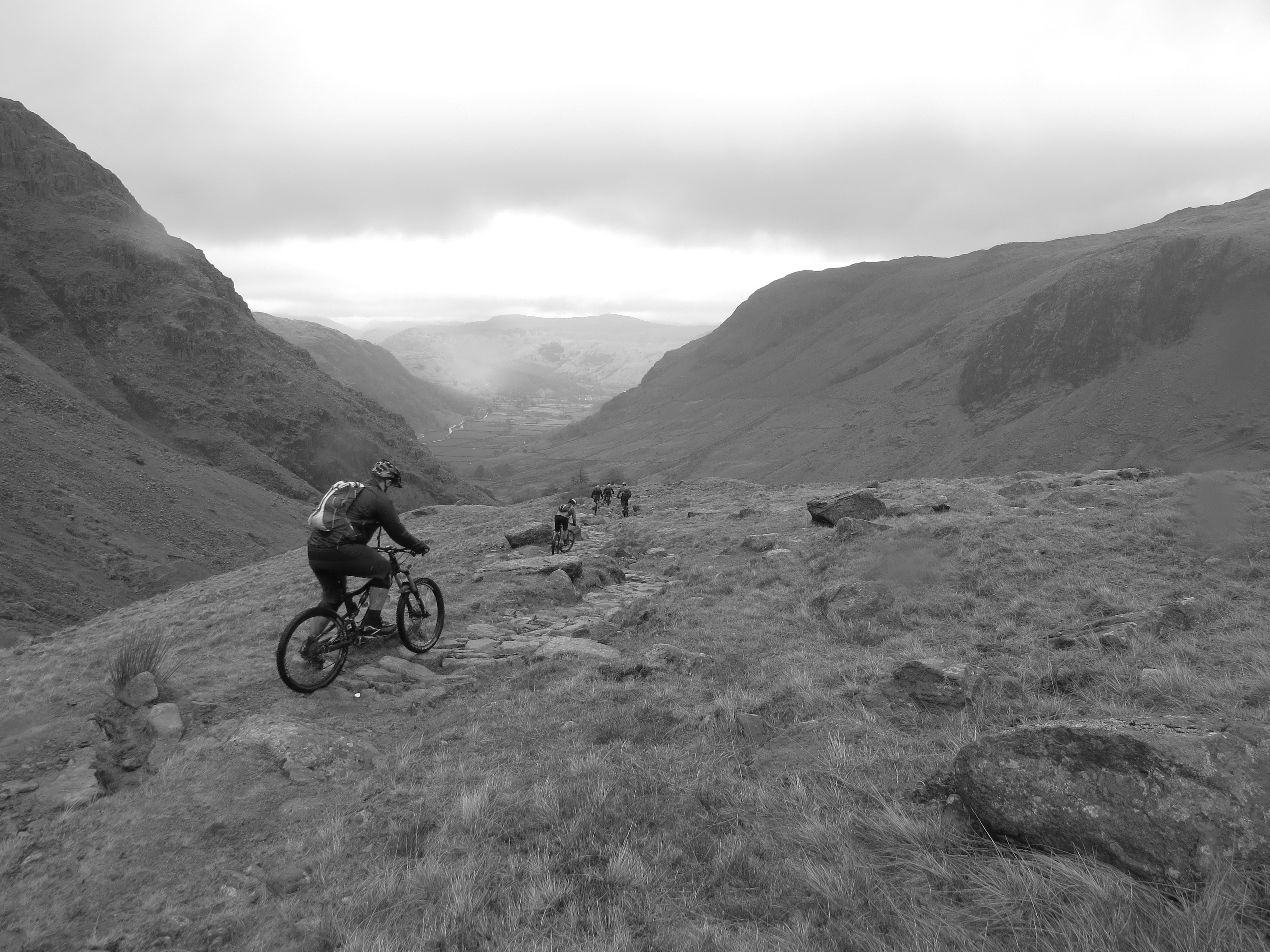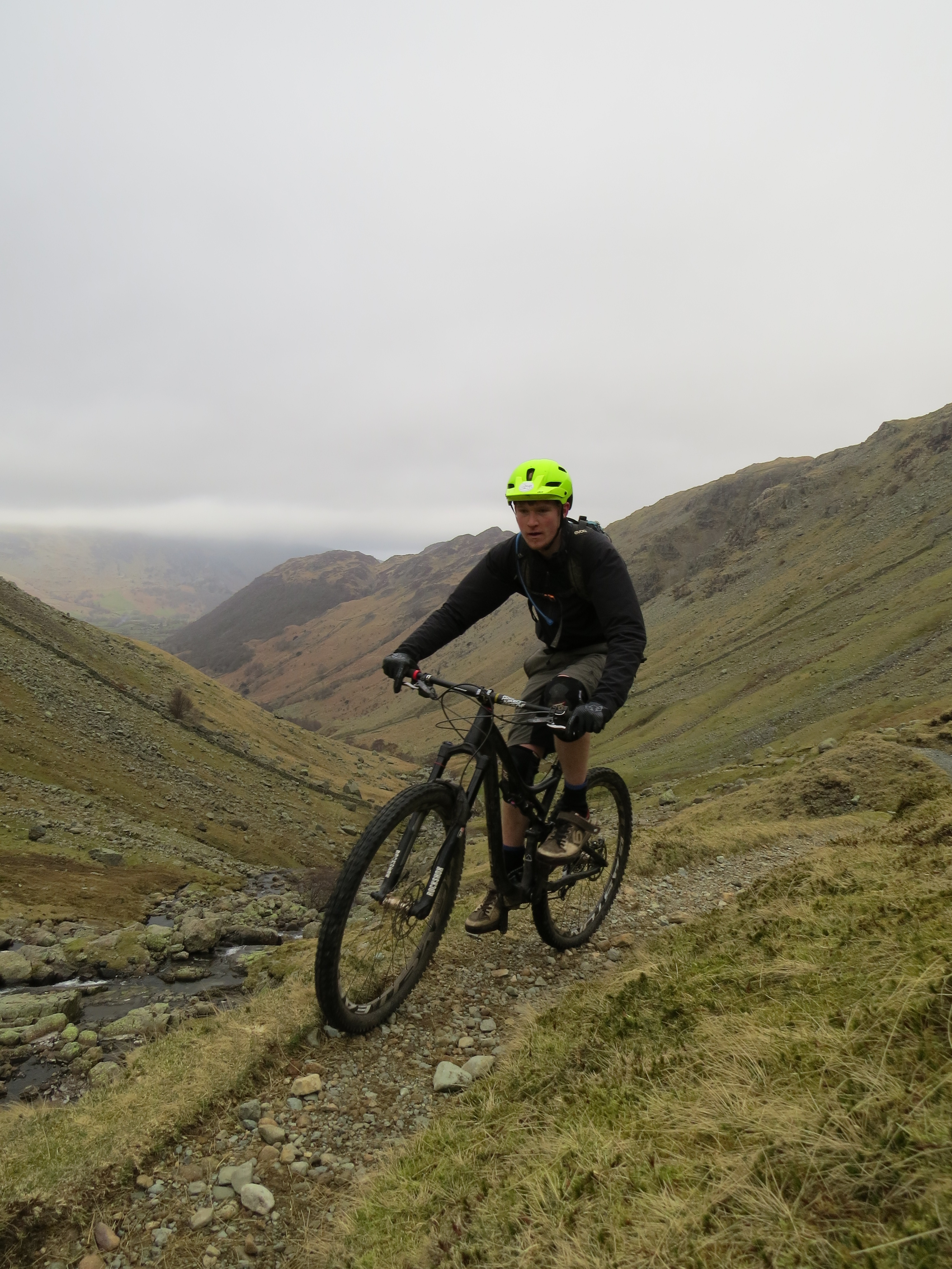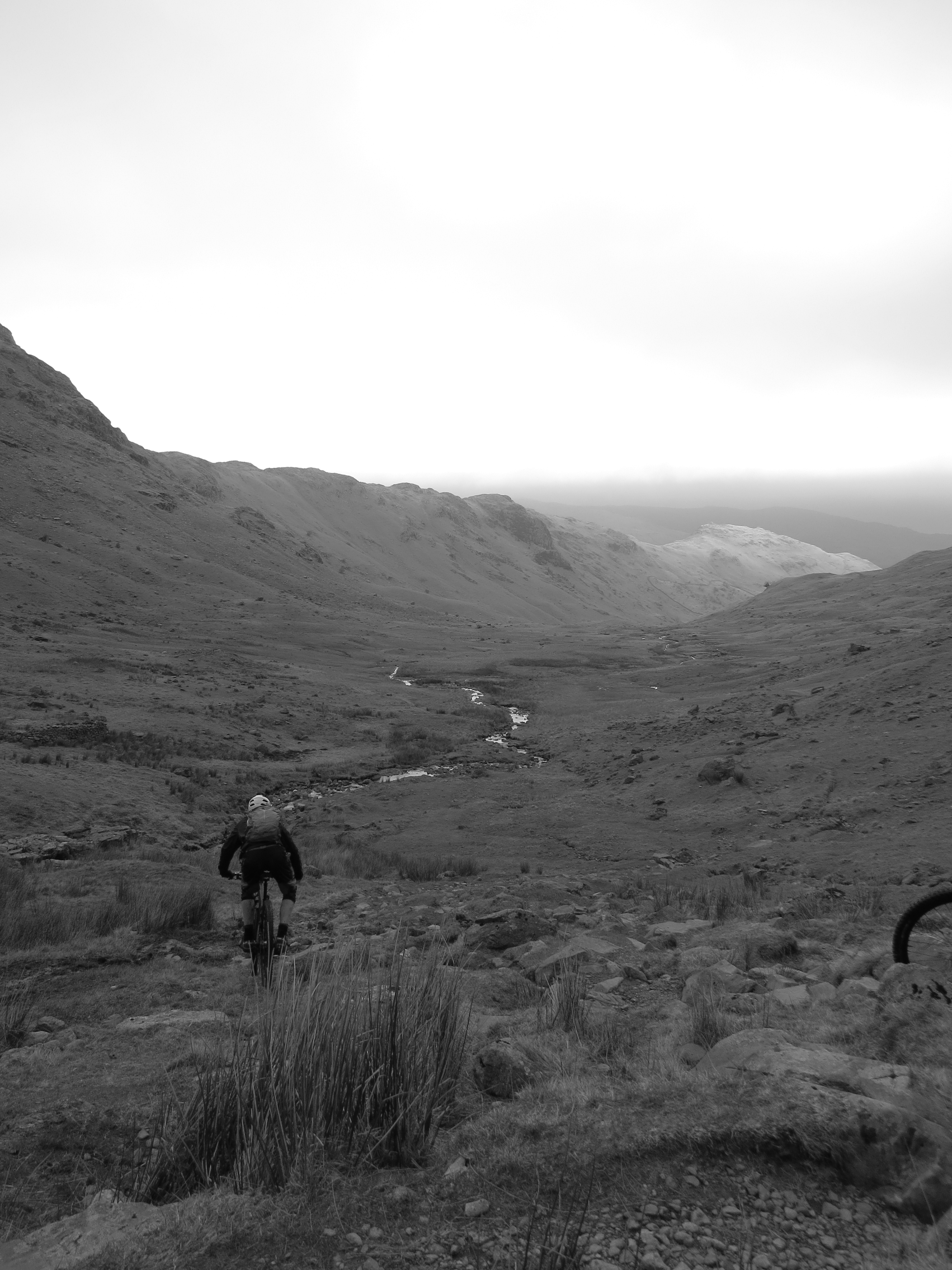 MWIS was being as optimistic as ever, forecasting 60mph winds up high. On the basis that blind optimism beats scientific forecasting though, Seb, Craig and myself set out from Stonethwaite on Saturday to hit some passes and explore some new singletrack. We rode and carried up some technical climbing, crossing the watershed in dense, wind-blown fog before dropping into a fantastically technical descent in Far Easedale and down to Grasmere. A short up and over on footpath cuts a long road detour round to Langdale, and was hypothetically nice and dry, with a theoretical section of exposed alpine singletrack in a natural ampitheatre gulley that we . We stuck to the road. Obviously. From there it was one more pull up to Stake Pass and a long return down some frankly ridiculous switchbacks (the literal incarnation of ‘turning on a sixpence) that the straight line on the map had never hinted at, and along the valley to Stonethwaite. Day one done!