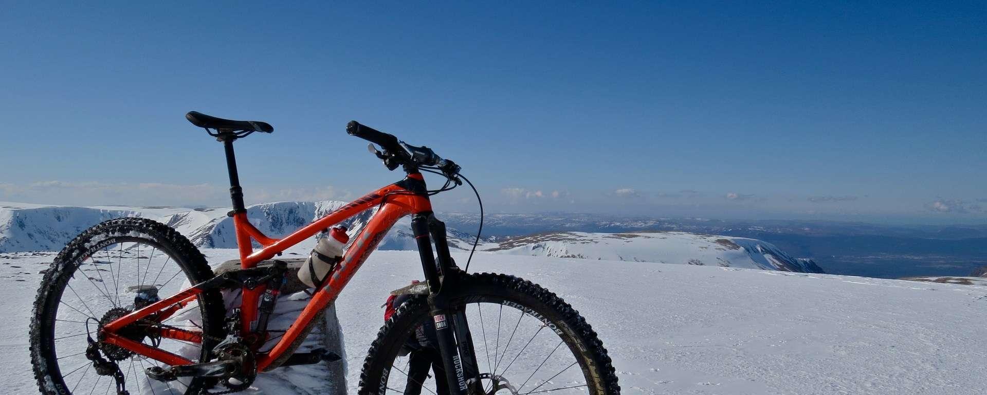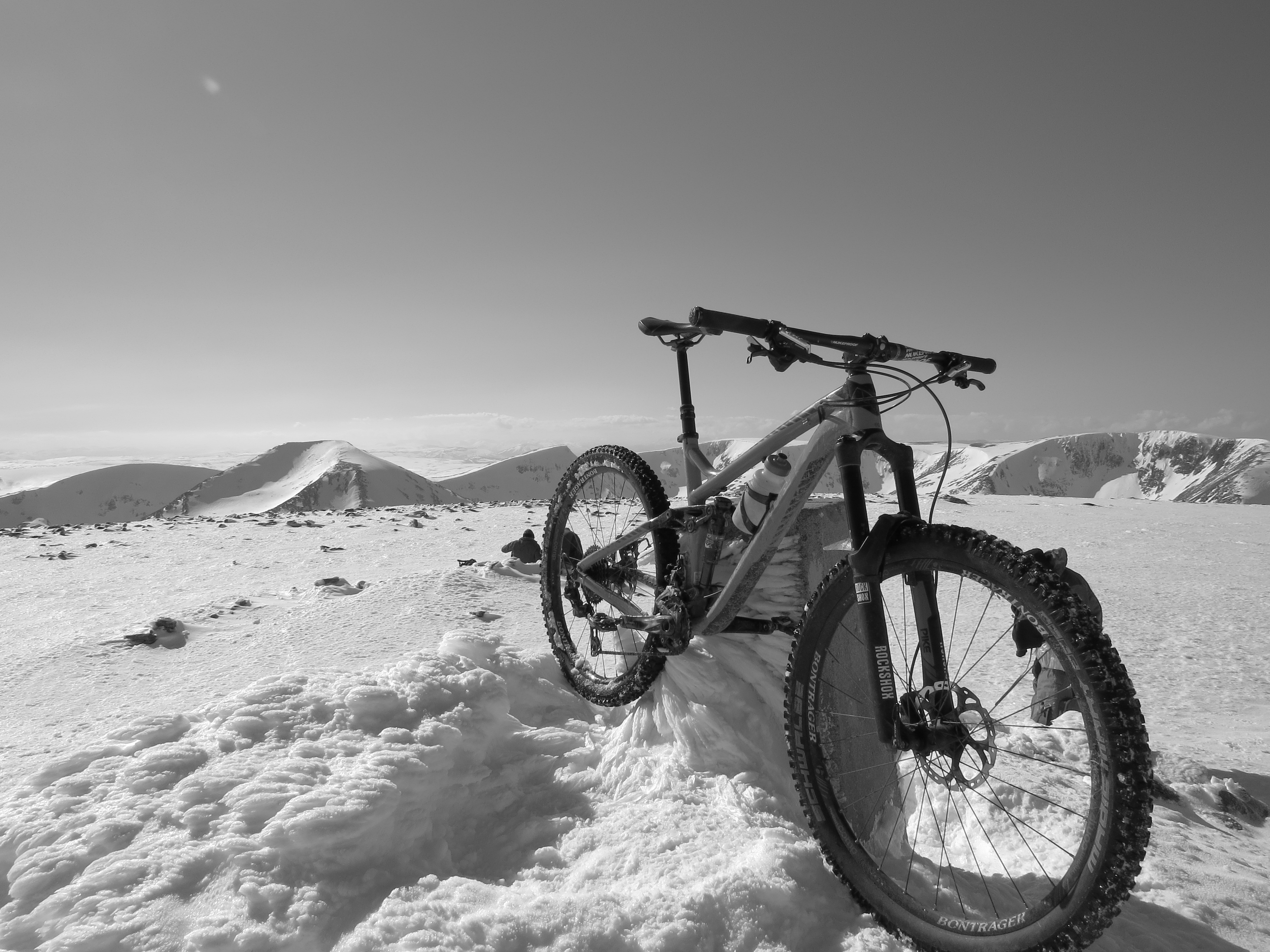 I’ve waited all bloody winter for the conditions to be right for a crack at snowbiking, and at last this week there was a perfect forecast! Glenmore Lodge is the perfect place from which to watch the corries and to strike out for the hills, so I rode up the old ski road to the carpark, past the confused looking lifties and up the climber’s path into the corries. Up the Lochain ridge, a final steep section of snow and finally onto the plateau itself. I had only planned to hike up and descend Lurcher’s gulley, but the going was so good that I reckoned I could try to tag Ben Macdui itself. The snow couldn’t have been better: just firm enough to pedal over, so the the ride across the plateau to Scotland’s second highest summit at 1,309m took barely thirty minutes, and was almost entirely rideable.