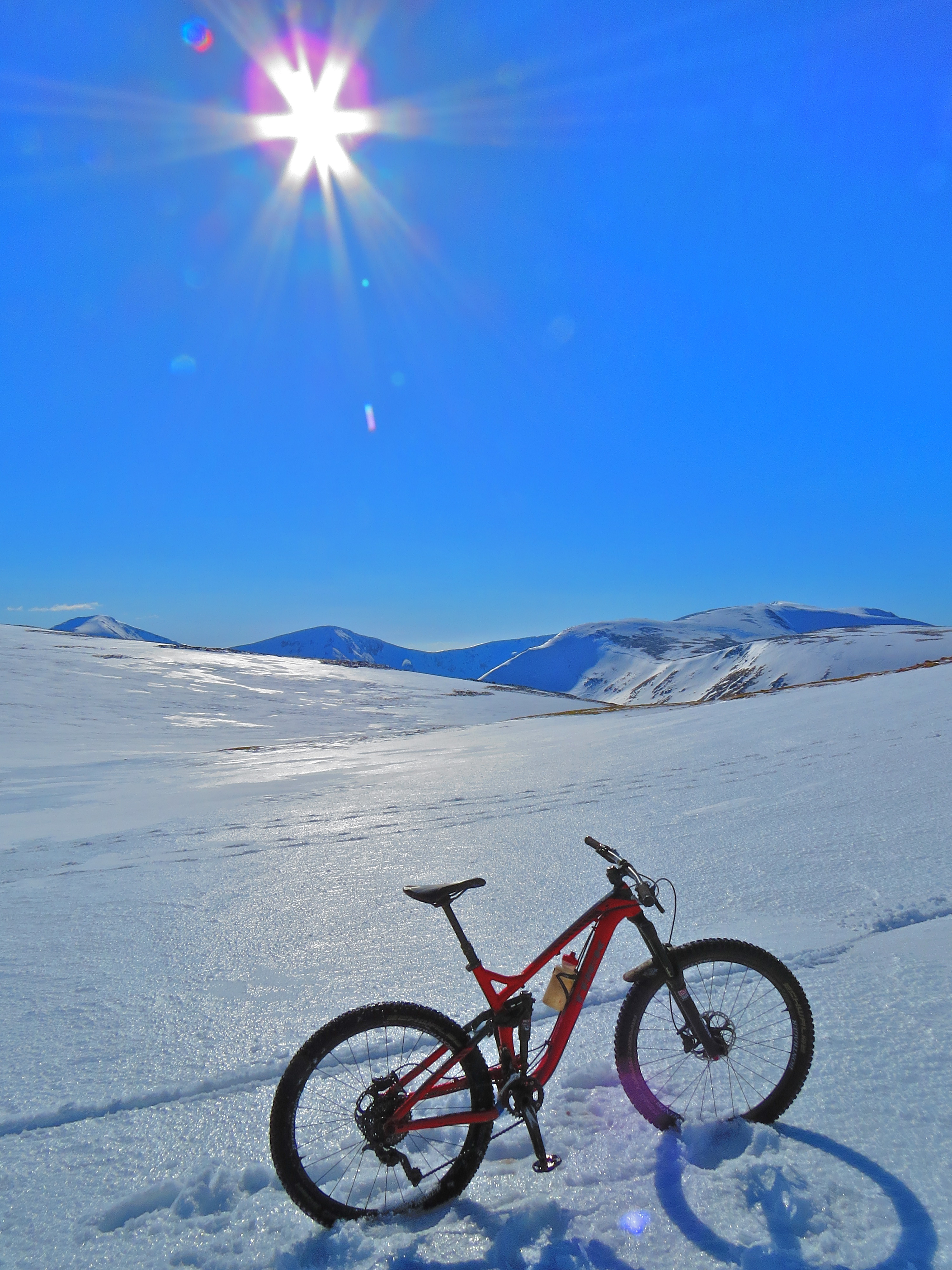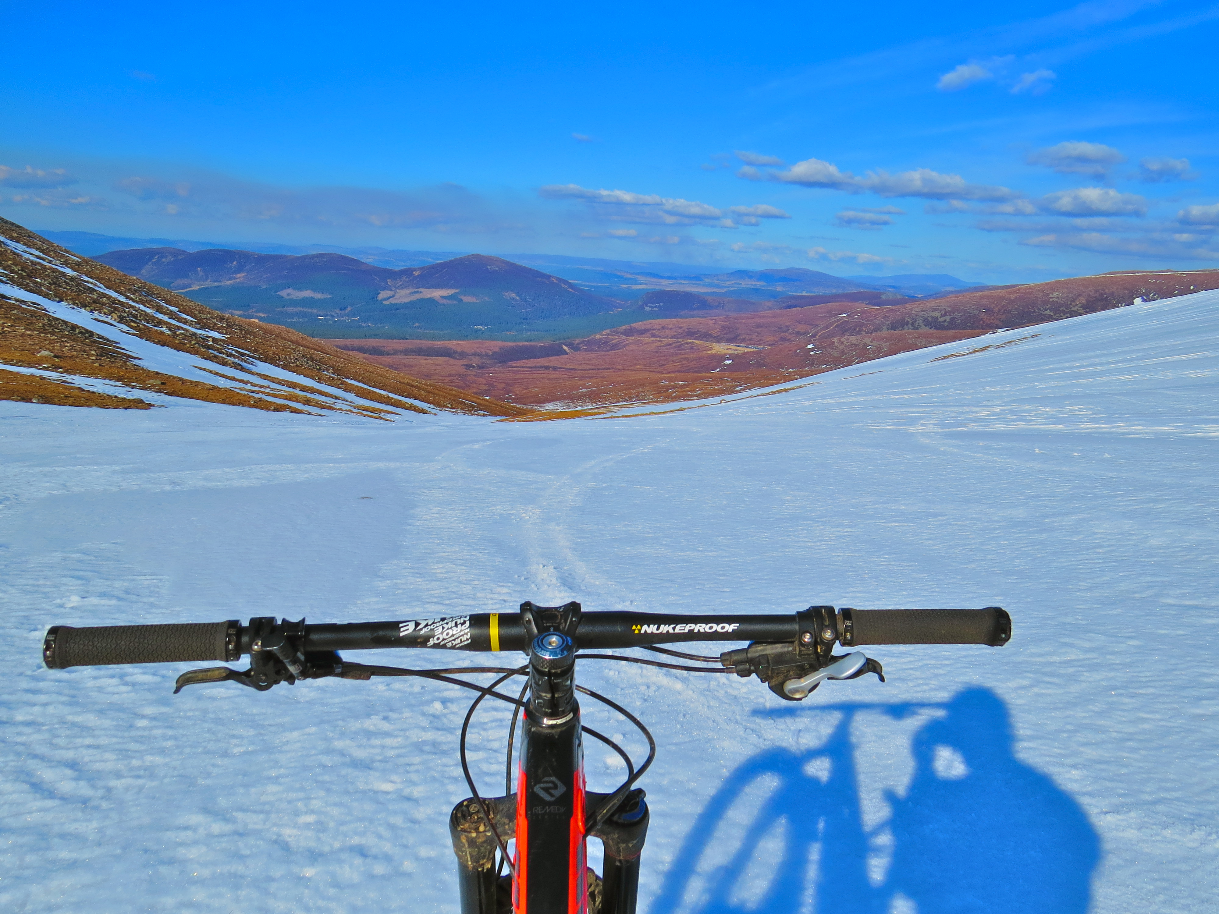 The snow was so firm that steeper sections could be climbed in zigzags,traversing the slope before putting in a burst of power to swap direction. I dropped the tyres down to 12 psi to give some flotation on the snow at the edge of the plateau, and surprised some ski tourers when I passed them! The ride back after sandwiches and pictures at the summit was even better – straightlining resulted in warp speed being reached almost immediately, and the snow had softened enough in the sun to allow some nice turns on steeper sections. I had work at 4.30 (life is tough) so there was no time to waste and I cracked on down Lurcher’s gulley, got my waterbar-hop on back down the climber’s path, and span back into the ski centre before blasting down the Allt Mor path, which pops out right beside the lodge back down at 300m.