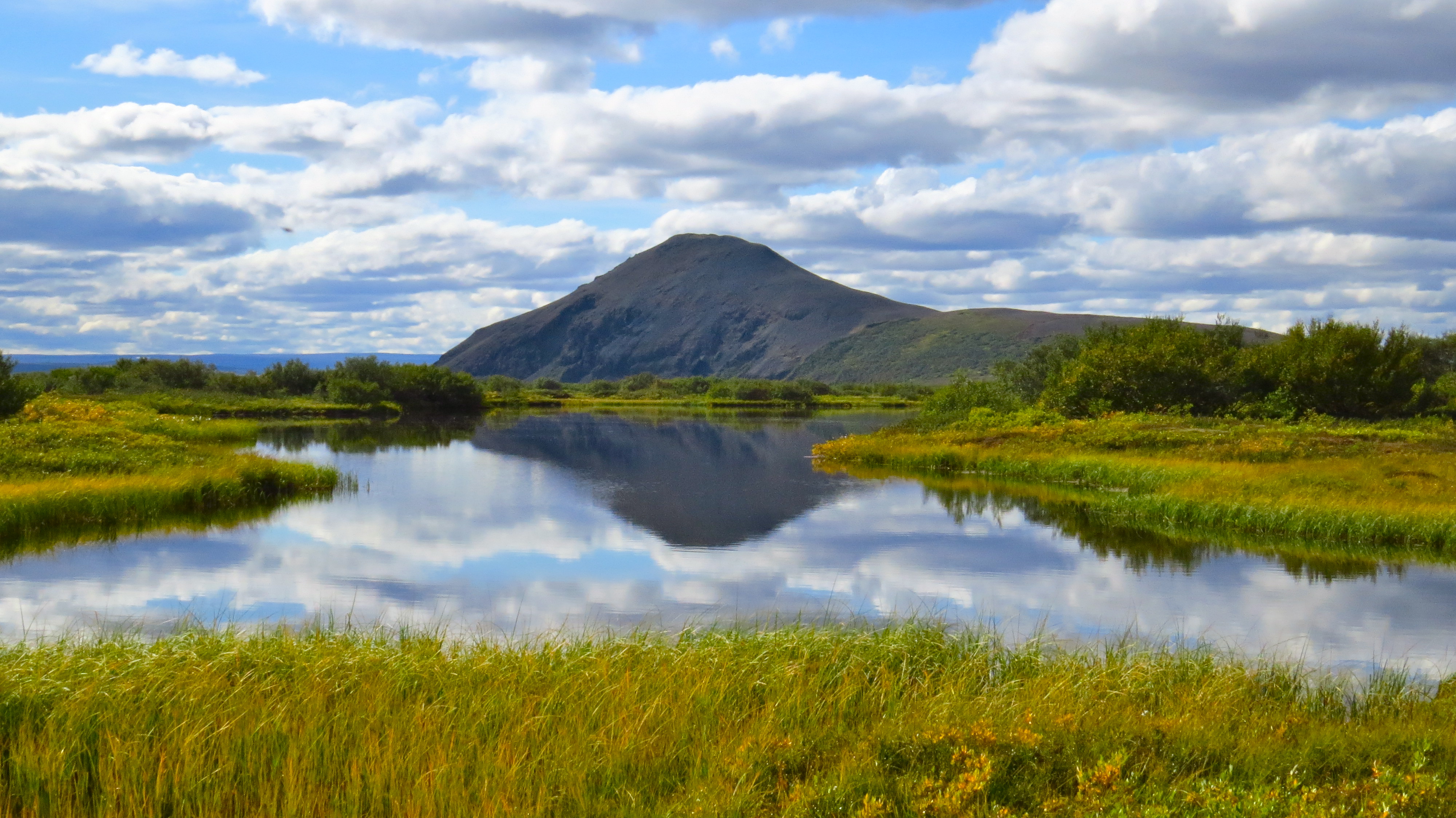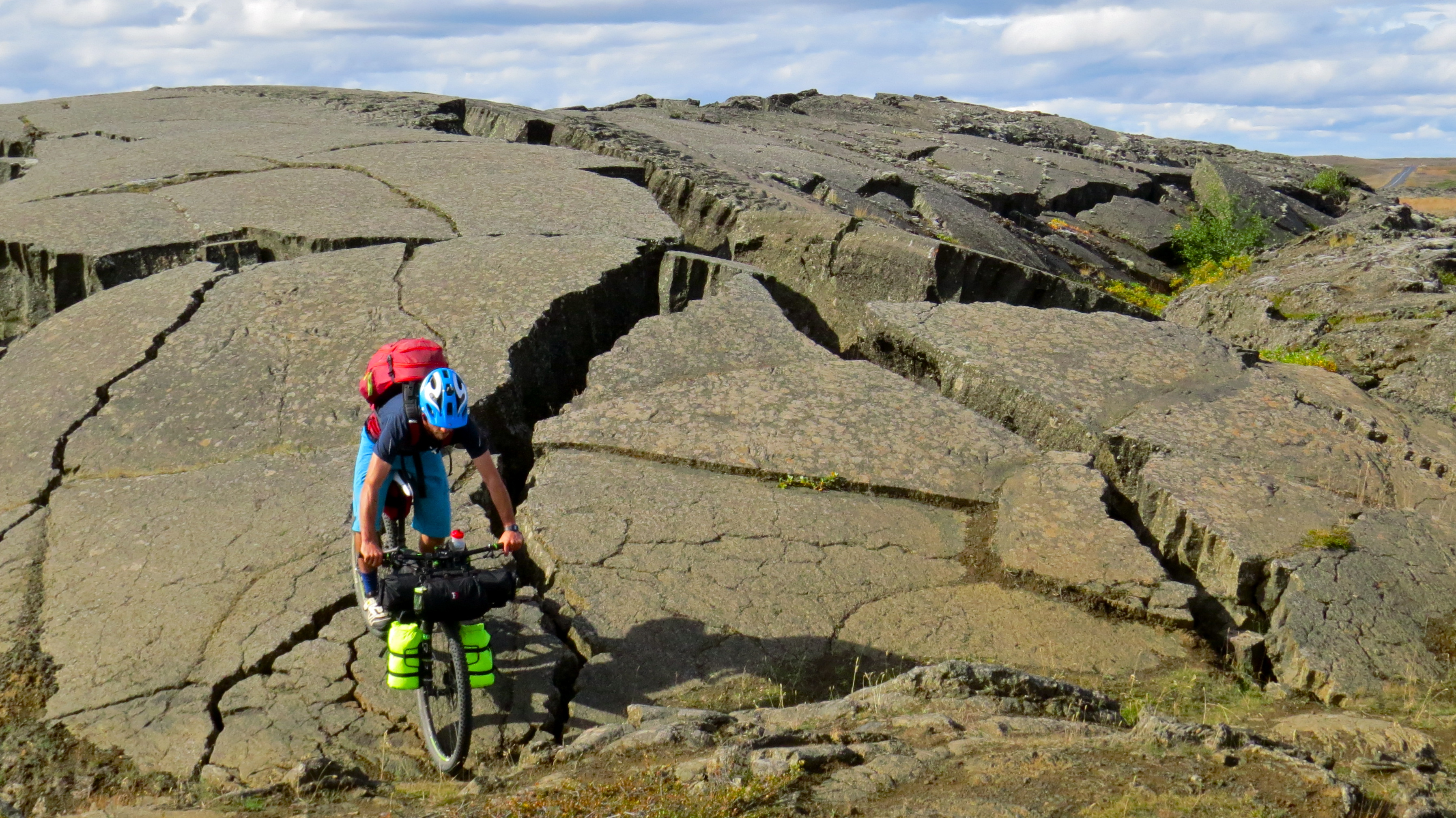 Originally we had wanted to take a completely different route, traversing the empty northeast corner of the interior to the volcano Askja, to peer over its crater and possibly find our inner spiritual beings, who knows. Iceland obviously thought was a little pretentious, and had other ideas. It began to shake its geological fists, and those tremors meant that the entire area was shut off and at least two sheep farmers evacuated due to the imminent risk of an eruption and subsequent massive glacial flood. We were disappointed, but given the outcome if the forecasts turned out to be true we decided it might not be wise to head that way if it all got a bit hot. Instead, we decided to follow our backup plan and cross the interior on the more westerly Sprengisandur. We had reached Myvátn lake in the north on the 7th August, and enjoyed crisp sub-arctic sunshine that gave the water and the scrubby vegetation a late summer glow. Although we were near to sea level, the plants were similar to those that you might find at 1,000m on the Cairngorm plateau at home in Scotland. Just in case we got carried away and started noting other similarities, bulbous protrusions of solidified lava dotted the land beside the road, looking like gigantic, cracked mushrooms. Of course this necessitated an official detour, and we rode over the surfaces of the rockshrooms, hopping over the crevasses that fell away to their centres. Oddities like this need to be documented, and we would be failing the good people back home if we didn’t work out their surface friction coefficient…