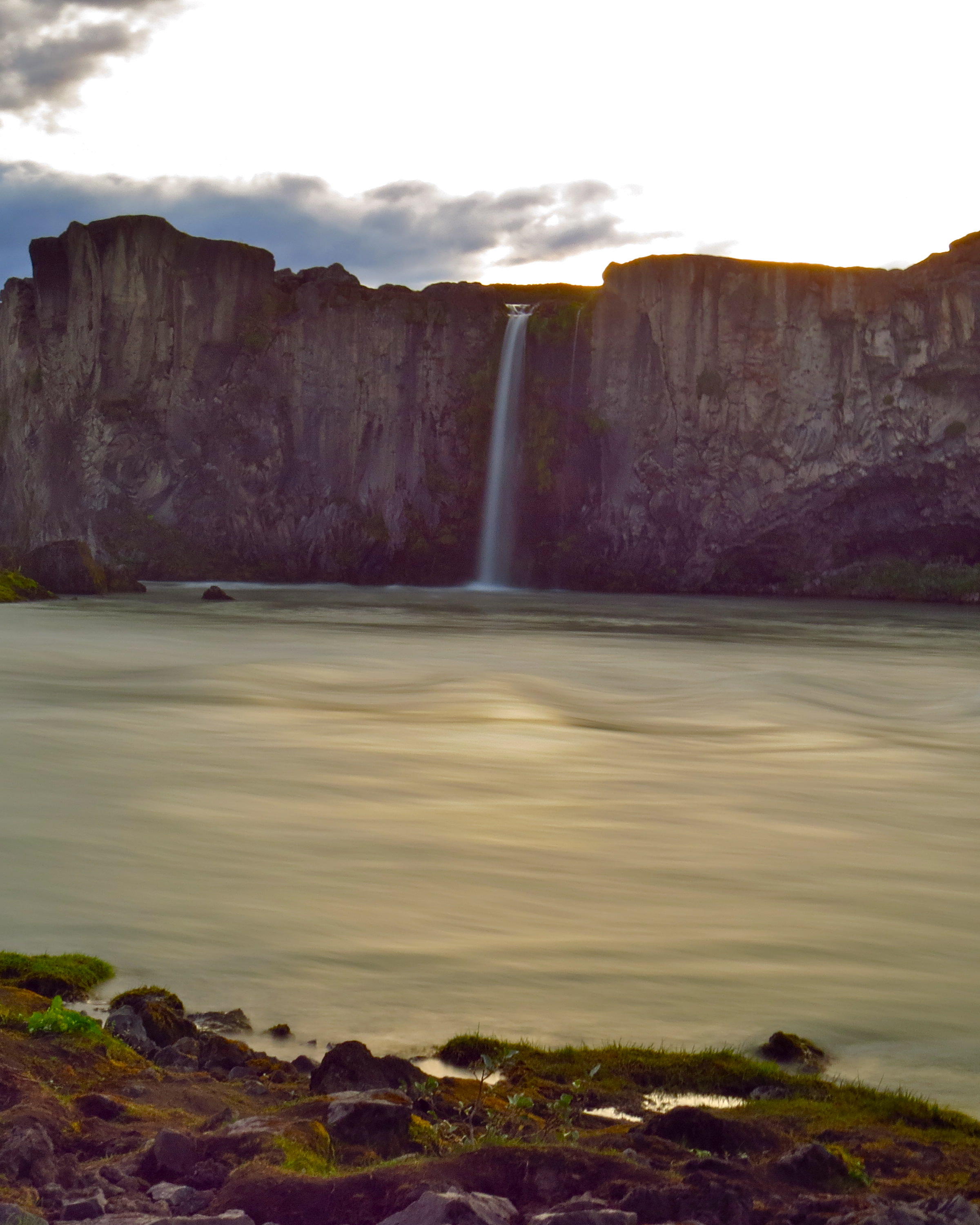 A short stretch on the main road brought us to Godafoss, a waterfall that we were dying to meet. Iceland is not short on waterfalls, and in fact you would be justified in saying that they hoard the things, they’re everywhere! If Godafoss had managed to stand out and make a name for itself amongst a clearly saturated market, then it must be good. Having already seen quite a few so far, we thought it might all turn out to be a bit of an anti-climax. No chance though, as the crescent-shaped ‘waterfall of the Gods’ lived up to its name: the glowing evening lit up the churning water, and we lost track of time just watching it fall endlessly. Other tourists in large 4x4s pulled in from time to time, climbed out and took photos for a while before the novelty wore off and they would begin to drift away. At one point a selfie-stick was brought out, and the man wielding it posed awkwardly beneath it for a quick photo. No comment.