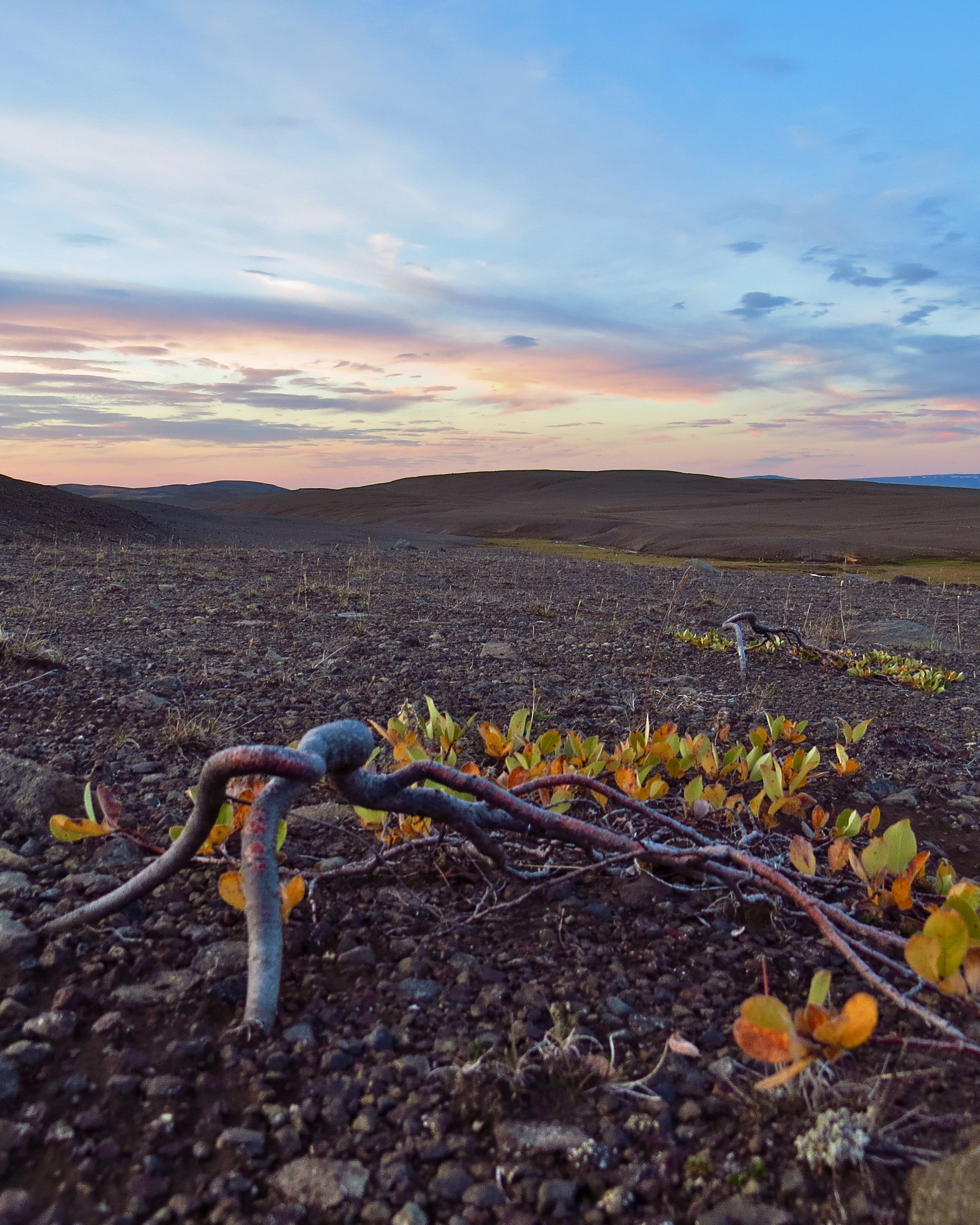 A campsite on the lip of the high plateau marked the end of our first day, after we nestled the tent in a tiny gulley populated by the smallest of crystal streams. It was a miniature paradise, the only green splodge on an otherwise grey desert. Herðubreið, the ‘queen of mountains’, swam on the edge of a sky that was bruised a deep, hazy blue. Although it was windless, the first chill of autumn had settled into the evening air, so our transition from lowland to highland coincided with the arrival of a new season as autumn came to the north.