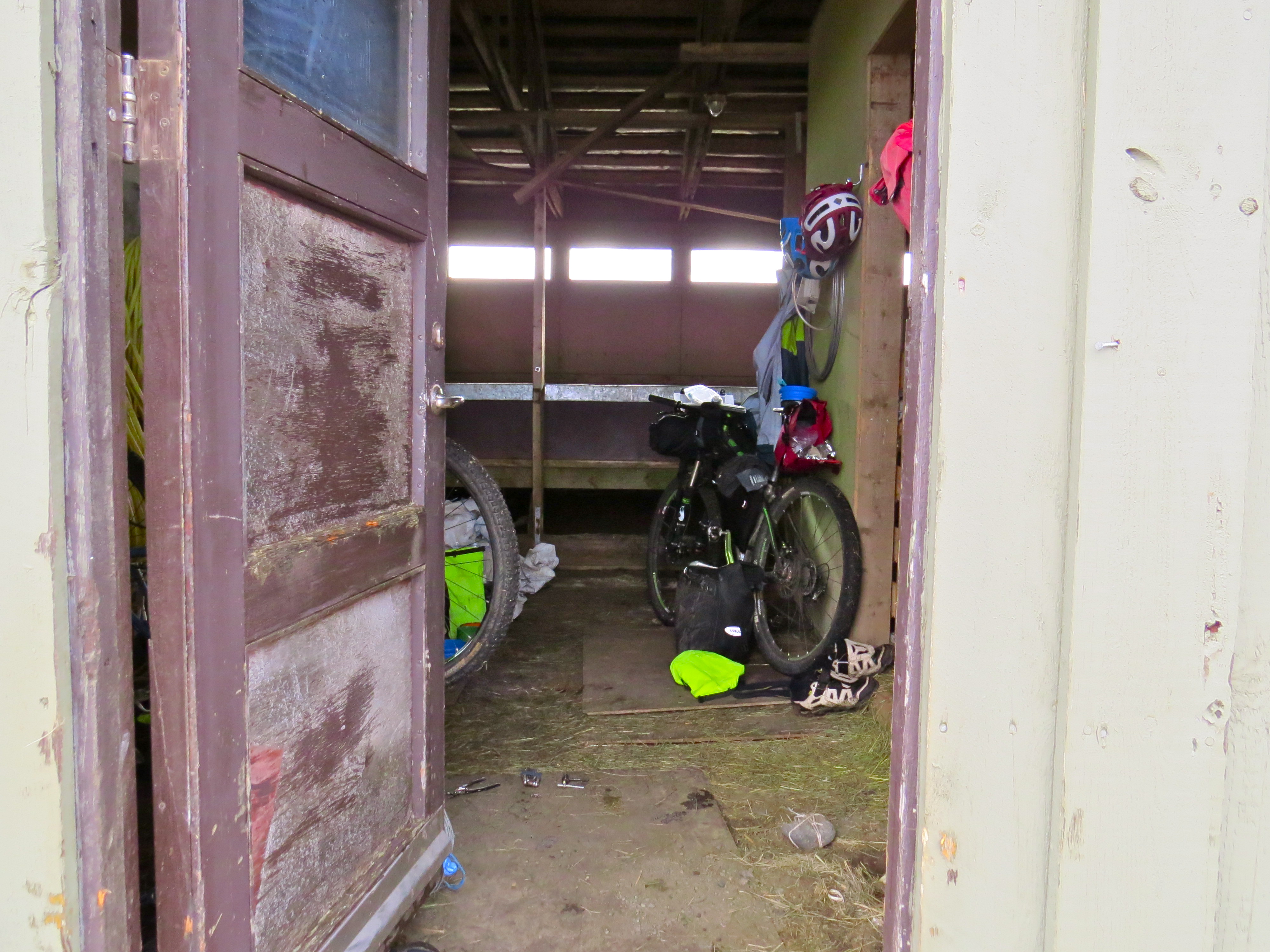 The tent survived another night, albeit with a few more bent poles, and the next morning dawned with a rain-laden wind still blowing. We both had cabin fever by that point, and elected to set off anyway towards the next hut down the line, Versalir, 60km away. It would be a tall order in the headwind, still blowing around 35mph. What emerged was the worst day I’ve ever had on a bike up until that point (more on that later). The rain began in earnest as we set out, the wind blew steadily in our faces, and we had learned from a phone conversation with the campsite in Landmannalaugar that our food package hadn’t made it. Instead, it was 150km away in Hella. The Icelandic post service didn’t go as far as Landmannalaugar, but instead of telling us that they had just gotten in it as far as they could. Not so helpful, and the upshot was that we were no longer riding towards a package of delicious treats to get us through the endless oatcakes and instant potato. Not that we had much chance to dwell on it; we fought the bikes up hills, crested them, and then fought them down the other side, pedalling hard even with gravity on our side. The temperature was in single digits and the water, as it does, quickly found its way past whatever expensive clothes we put in its way. This was it: we had found the land of wild adventure that we set out for, and it had suddenly lost its appeal. We made progress at around 5km/h, stopping every two hours or so for a break from the mental battle with the wind. Doubting we would make Versalir, we began to cast about for camp spots, but there were none. The damaged tent didn’t seem up to taking another battering, and there was zero shelter on offer from the wind, no folds or wrinkles in the land to snuggle in to, not even any decent dirt among the gravel. At one point a rental 4×4 pulled up silently behind is, giving us a shock when it slid alongside us. The window wound down suddenly, and I thought we were about to be offered a lift or some help, given that it must have been visibly obvious that we were having a crap time. I opened my mouth to say hi, but a camera was pointed at it, the shutter clicked. I caught a glimpse of a woman wearing smart clothes and lipstick, and then nothing but my own bemused reflection as the window was wound up, and the jeep sped past. If I ever seem grumpy about the other tourists we met in Iceland, then here is the answer. It was not the last time that this happened. The best was possibly when a bus disgorged its payload of fat American holidaymakers on the top of a hill. As we crested it, sweaty and generally looking disgusting, fifty lenses swivelled in our direction and began to reel off spools of photos. The only person to actually make eye contact with us before turning to new distractions was a very large woman, who said simply, “you guys are just the bravest!” We assumed that the bravery stemmed from the fact that we were doing exercise without being in walking distance of the nearest McDonalds, but didn’t have time to check. Back on the long road to Versalir, we had no choice but to truck on, and so began mental fantasies about what I would eat first when we got to the warm, dry hut. We agreed to splash out and pay for a night indoors, away from a damp and broken tent. The line in the dark gravel seemed endless, but we knew that somewhere along it was our salvation. Hungry, wet and tired, we counted out the remaining few kilometres as they eked past, and after 10 hours on the road we crossed the final river and saw the hut. It seemed quiet and unwelcoming, set as it was beside another angry brown river amidst the endless gravel plains. There were no lights, and no vehicles; given where we were we got a sinking feeling, which was confirmed when we tried the door. It was early September, the beginning of the Icelandic autumn. Soon the snow would be here in the mountains, and the hut had been locked up and left for the winter. Too wet and tired to be angry, we resigned ourselves back to the tent. As a last shot though, we tried the door to the stables where trekking ponies stay. It was unlocked, and the only occupant was a large RIB on a trailer. Excellent! Half an hour later we had moved in, with the tent inner pitched among the dirty straw, and a hot drink production line on the go. We even found a rusty, half-empty can of gas on an upper shelf, so the hot drink good times could roll all night, or at least for an hour until we fell asleep.