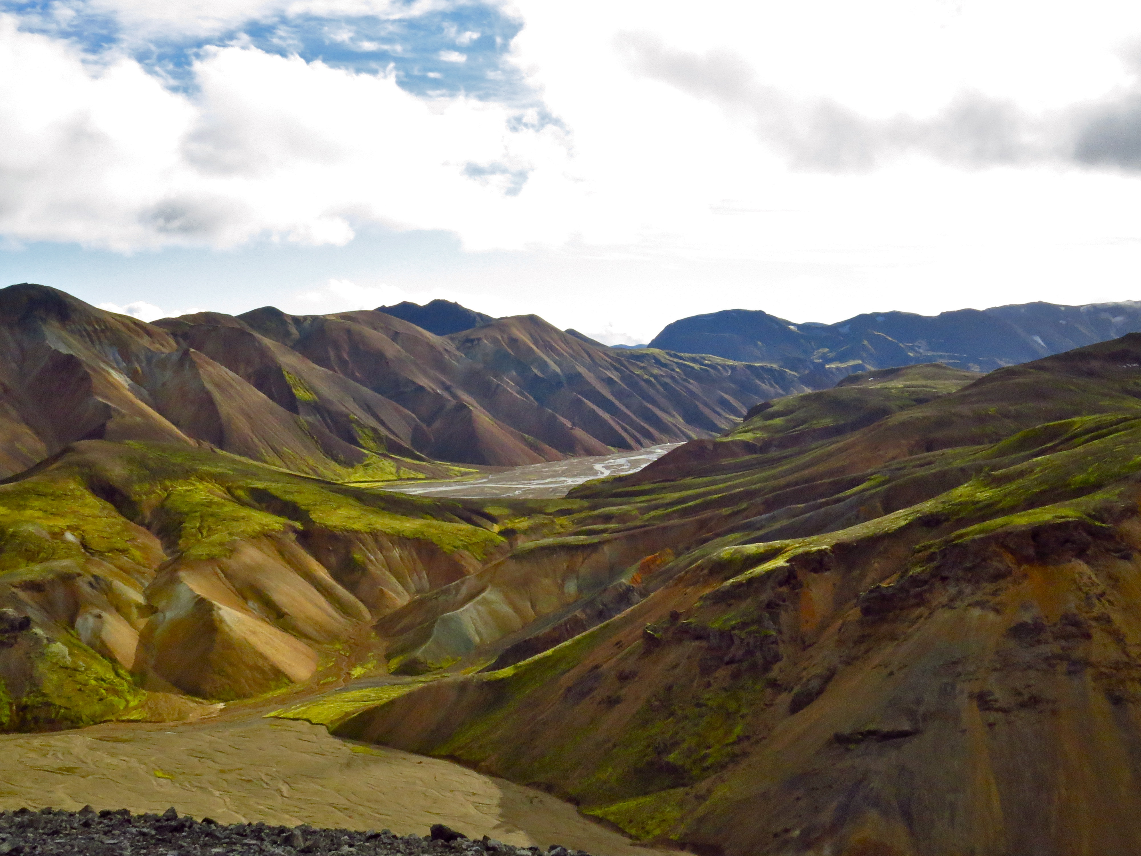 Our food situation was becoming a little short, so we had another day to ride out the roadhead at Hrauneyjar. The best thing to do seemed to be for Annie to hitchhike out to Hella (Lone-travelling girls get lifts more easily, we figured), and Annie is the experienced hitchhiker of the partnership, anyway. Also the idea of a massive lie-in appealed to me, I won’t lie. We got the greasiest, most disgusting burger and ice cream that you ever saw at the service station there, and Annie’s food mission was over in just a morning. From there it was a quick half-day pedal to the volcanic hills of Landmannalaugar, which we were gagging to see.