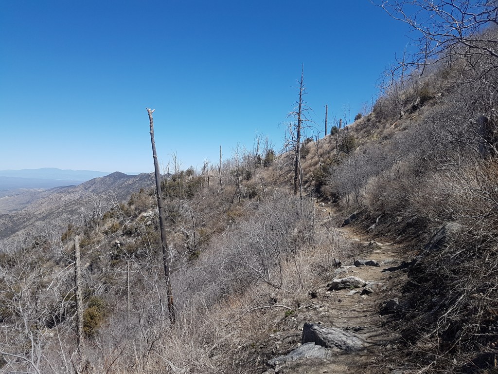 I felt thirsty, but awake, so the best plan seemed to be to push on and hope to be able to beg some water at Molino campground, or find a creek on the climb after it. Dawn broke as I crossed the gap, and the mental boost from having ridden right through the first night stoked me up enough to ride all but one chute on the descent down to the highway. Still high from that, it was with relief that I hit a creek on the steep singletrack paralleling the highway, and set off into the second morning feeling ready to see this last section of climbing away.