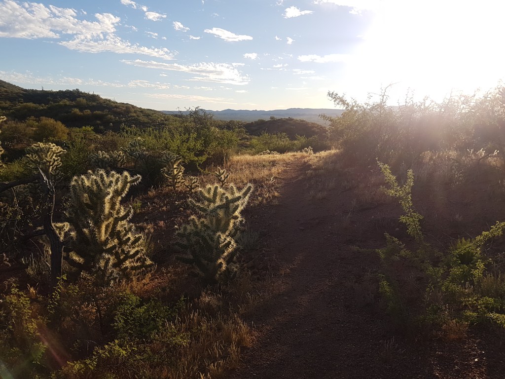 The thirty miles from Tiger Mine Road were hot, hilly and slow. The trail looped its way in and out of every single wash, some were shallow, but others were tens of metres deep, and I soon lost track of my overall direction. Nothing was flat, everything was slow, and I was roasting in the afternoon sun. Even the toughest section of the route had its moments though: a Spanish guy touring the trail, who insisted on taking a picture and shouting that all of us racers were ‘heroes!’; the meditative of not caring how fast I was moving, so long I was moving; the low light refracting in the needles of thousands of cholla cactus as sunset drew nearer. When it did finally start to set I was nearing Antelope Peak, and caught up with Ty Hopkins at a gate. All afternoon I had been following a solitary tyre track that I was convinced belonged to Neil, trying and failing not to get distracted by it – it hadn’t ever occurred to me that an ITT rider (not part of the group start) might be ahead of me, but here was the answer to my pondering! Ty had started the night before the group, had a nightmare with a slashed tyre in the Canellos, and now here we were in the middle of the desert.