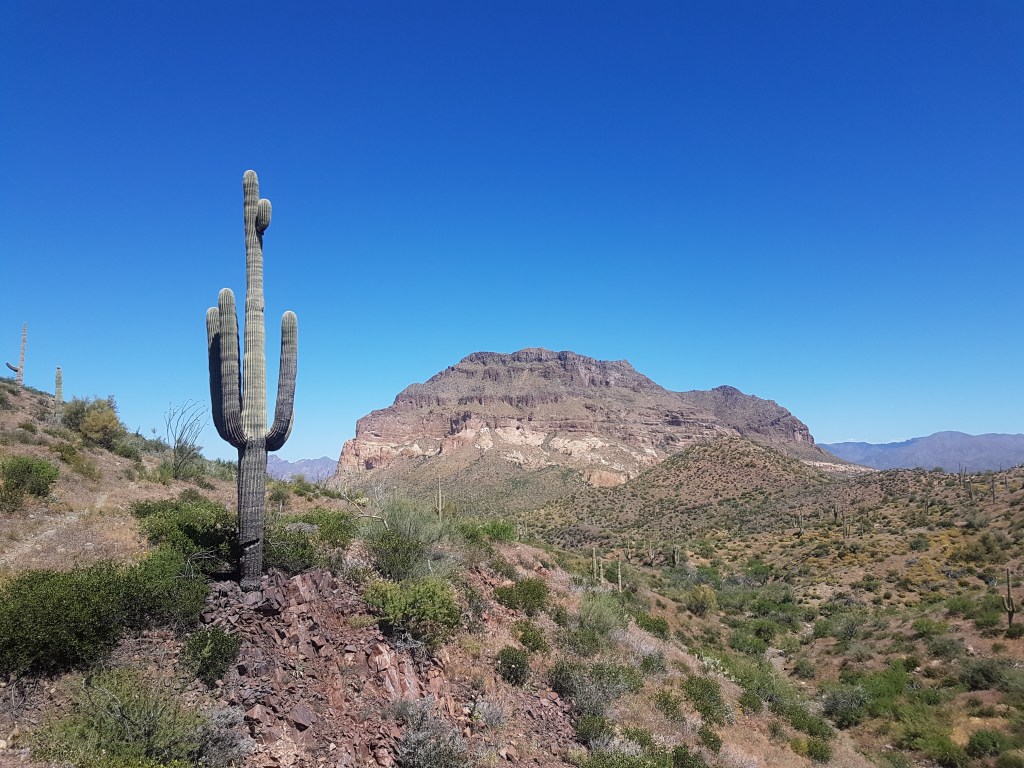 The last descent is a sucker-punch to the gut of weary bike-riders. I’m pretty sure it’s a net climb from the top to the finish, whatever the topo maps say. I’d fully had enough after the first few climbs, and decided to stop overthinking it and just empty the tank. Go out with a bang. Something like that. It worked, too, to an extent. The weightless flow of the night before came back, or a shadow of it, but this time it was the joy in the burning of muscle, the feeling of hot air filling my lungs, and dwindling supplies of blood sugar. Picketpost Mountain had appeared between the saguaro cacti, the pace went higher and higher, and I didn’t care any more.