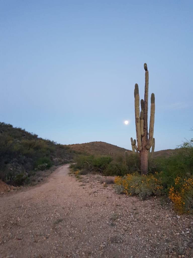 After all the punchy climbing of the first day, the 20 mile descent to Tucson is one hell of a reward. Just ‘down’ enough to make you feel like a hero, but not so fast as to require too much concentration: one of the most beautiful pieces of trail I have ever ridden, although the combination of a desert sunset and excitement to be plunging into the first night of the race might have helped. Normally the nights feel intimidating in an ultra, but as my body cooled down and a full moon rose over the horizon, I felt euphoric. When it came down to it, we had all chosen to be there, and I was determined to enjoy as much of the experience as possible. Cold pockets began to settle into even the shallowest washes, each one like passing through a cold shower, and these felt like an extra treat after the hot afternoon. When it comes down to it, we had all chosen to be here, and I was determined to enjoy as much of the experience as possible.