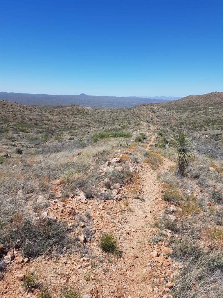 I could see a light a few miles ahead of me heading through Molino Gap, as well as the faintest glow of dawn breaking behind me on the skyline. As good as that felt, water was becoming an issue, and I looked forward to the water tank that I was expecting just before the hike-a-bike to the gap. I stupidly passed a perfectly good creek, thinking that I would take water as late as possible to avoid hefting extra weight up the hike, but when I got to the site of the tanks marked on my map, there was nothing but a bone dry creek bed. I wasted a good few minutes searching around in the dark, but there was no water there. It was below me, and I felt like a right spanner. My plan had been to water up, and then take a short sleep on Molino gap itself, above the cold air pockets in the washes. So much for that plan.