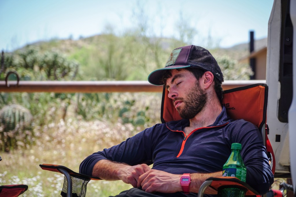 Ty made for great company, and I was glad for it. Our paces were similar, and to an extent so were the stories we swapped from the trail: heat, thirst and the beauty of the desert. The conversation was punctuated by my newfound ability to lean a hand or a knee into hidden cacti on the corners, with one prickly pear going right through my shoe into my foot. I don’t know where this skill came from all of a sudden, but picking spines out of my knuckles soon became tiring, and I had to apologise to Ty from the sudden yells and pitstops. With my original plan to grab 30 minutes’ sleep on the first night having been abandoned with the non-existent water tank, I decided to get a pre-emptive nap at freeman Road, the next water cache, before I started suffering too much from the deprivation. Ty decided to do the same, and we arrived around 9pm, just as the cool night air was beginning to make me feel alive again. I didn’t feel sleepy yet, but didn’t want the sleep monster to eat me, so I put on a windproof, set the alarm for 15 minutes’ time and lay down in the grass beside the trail…