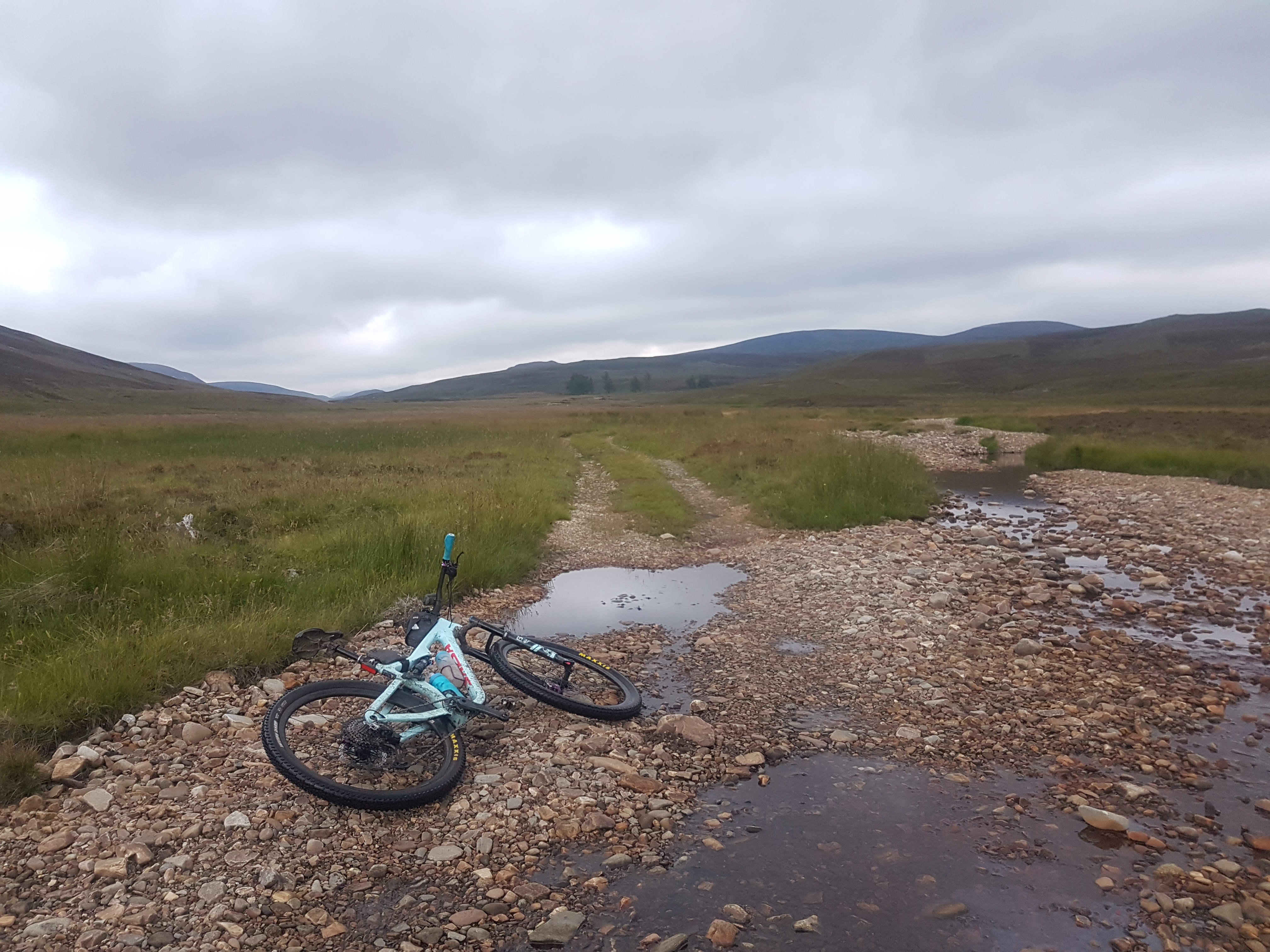 Once you leave the cairn at the junction for the summit, the trail becomes fantastic and infuriating, by turns. It’s a lumpy, technical antithesis to the first 80km, and your average speed plummets. It’s also my favourite type of riding, and as hard as it is I know that I have an advantage there, which makes it doubly fun. There is a rhythm to be found among all the water bars and boulders, so I searched for it as I crossed the Avon with dry feet at the fords, and hopped on and off the bike up the Lairig an Laoigh, before enjoying the long, rewarding descent down Glen Derry and out to Derry Lodge. This mountain section was dry-ish, but not as dry as I would have liked as the muck made itself heard in my chain and brakes.