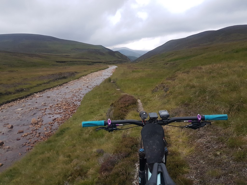 It was actually a few years since I had ridden the section from Bynack Lodge through to the Tilt. Now it felt like the Patience and Consistency phases of the ride had ended, and it was time to let it all hang out with whatever energy I had left. Thankfully I had just enough daylight left for the steep, narrow and precarious rollercoaster ride down the singletrack beside the growing river. I felt the odd kind of euphoria that I only associate with long bike rides at odd times of day, although I think some of it might have been the bottle of Coke I gulped before the singletrack. I actually got a little carried away and overshot the turning across the river to the infamous ‘sting in the tail’ section, but only by a couple of hundred metres to the Tarf Bridge, so no harm done.