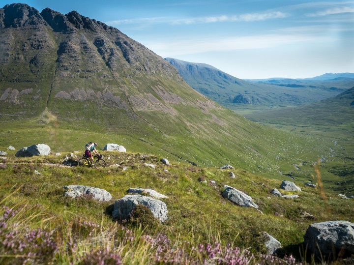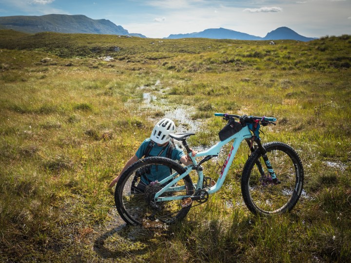 Bikes and packrafts are our favourite way of seeing familiar places with fresh eyes, so this was a perfect opportunity to put a new spin on an old favourite. Fisherfield Forest isn’t a forest at all, at least in the sense of there being many trees — ‘Forest’ is used in the Highlands to describe an area of good hunting land, at least among the wealthier, land-owning sliver of the population who can afford to do so. Up in Wester Ross, Fisherfield Forest is among the remotest parts of the Scottish mainland, with several munros (mountains above 3,000ft) and countless hidden coires and lochains among some amazing topography. It’s criss-crossed by a few old trails and trods, and it never fails to deliver an adventure, however you choose to get there.