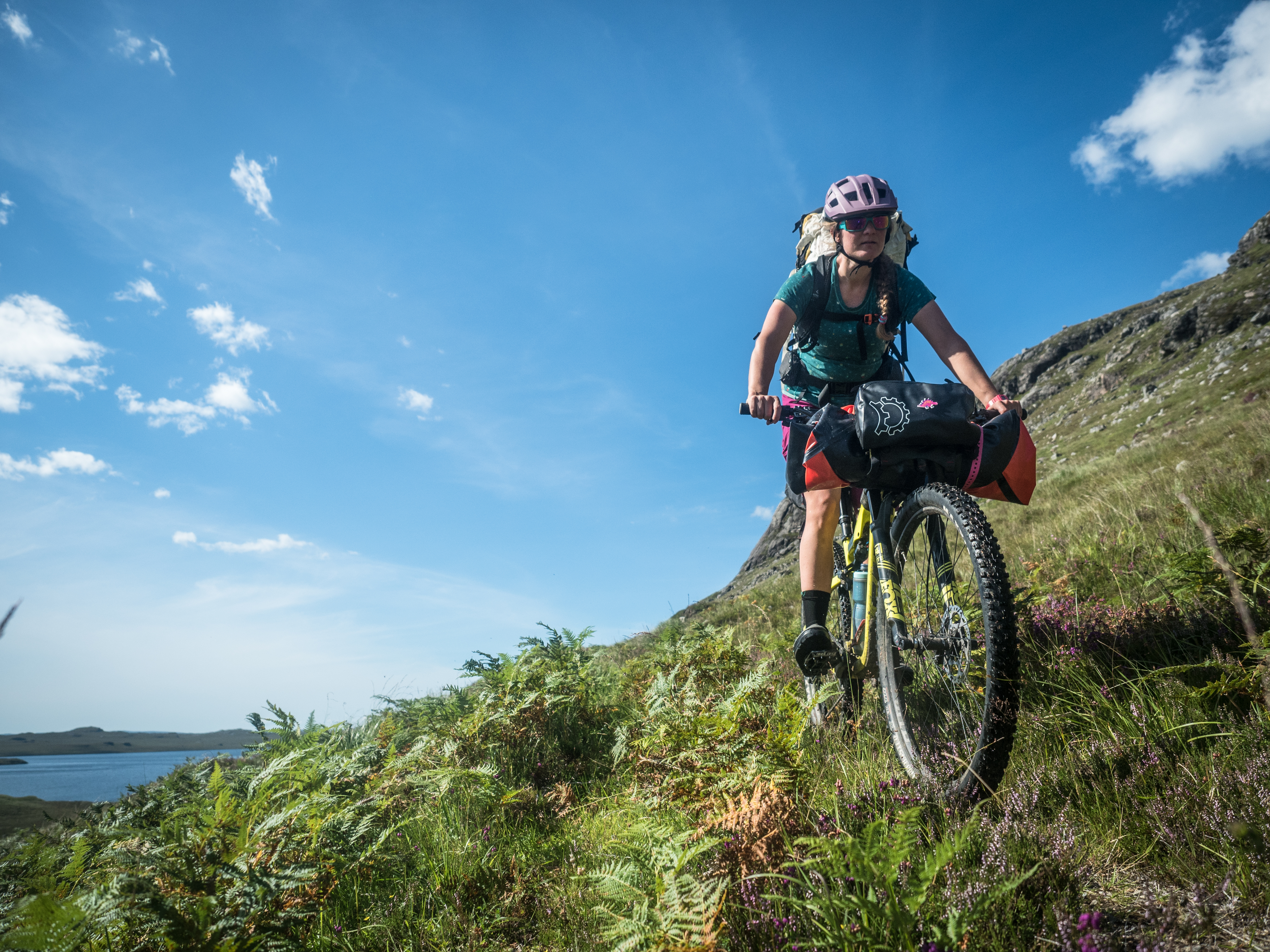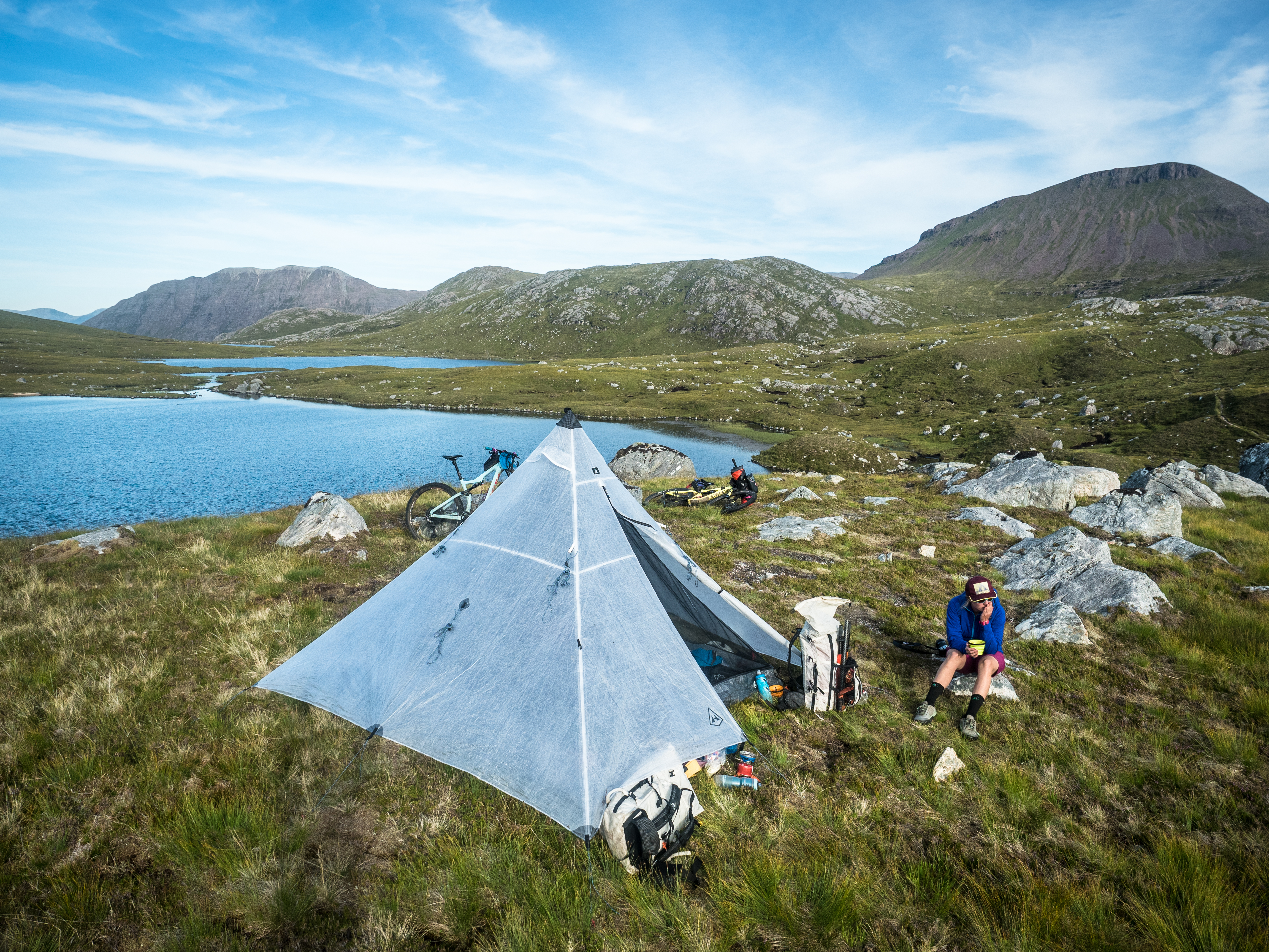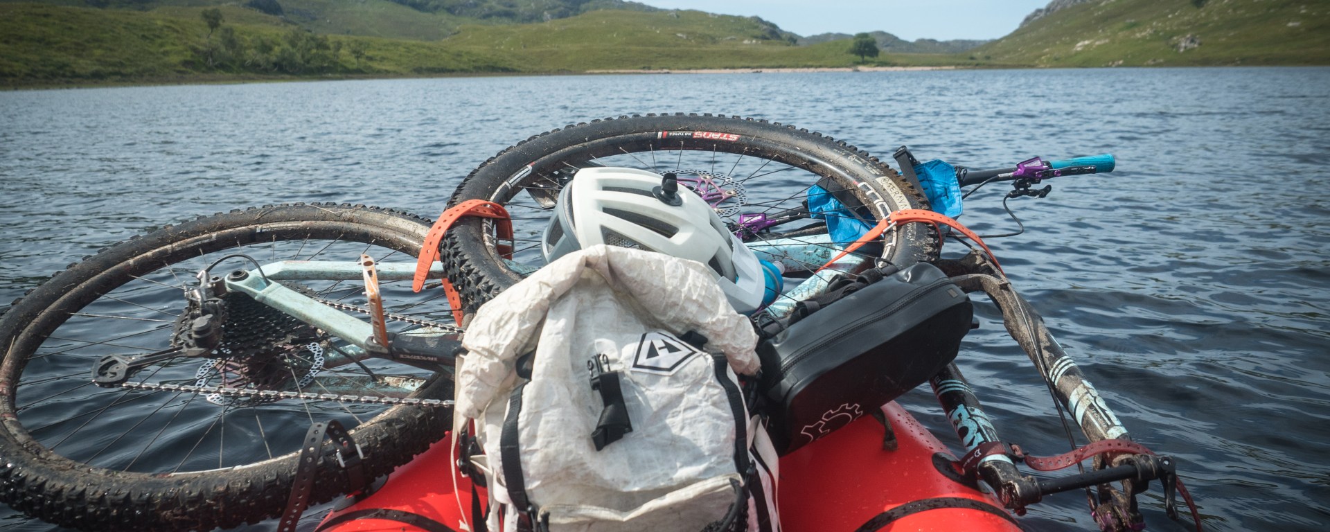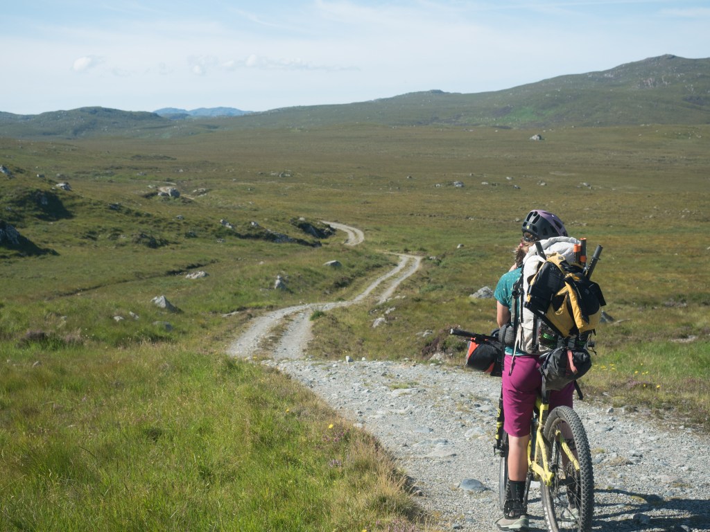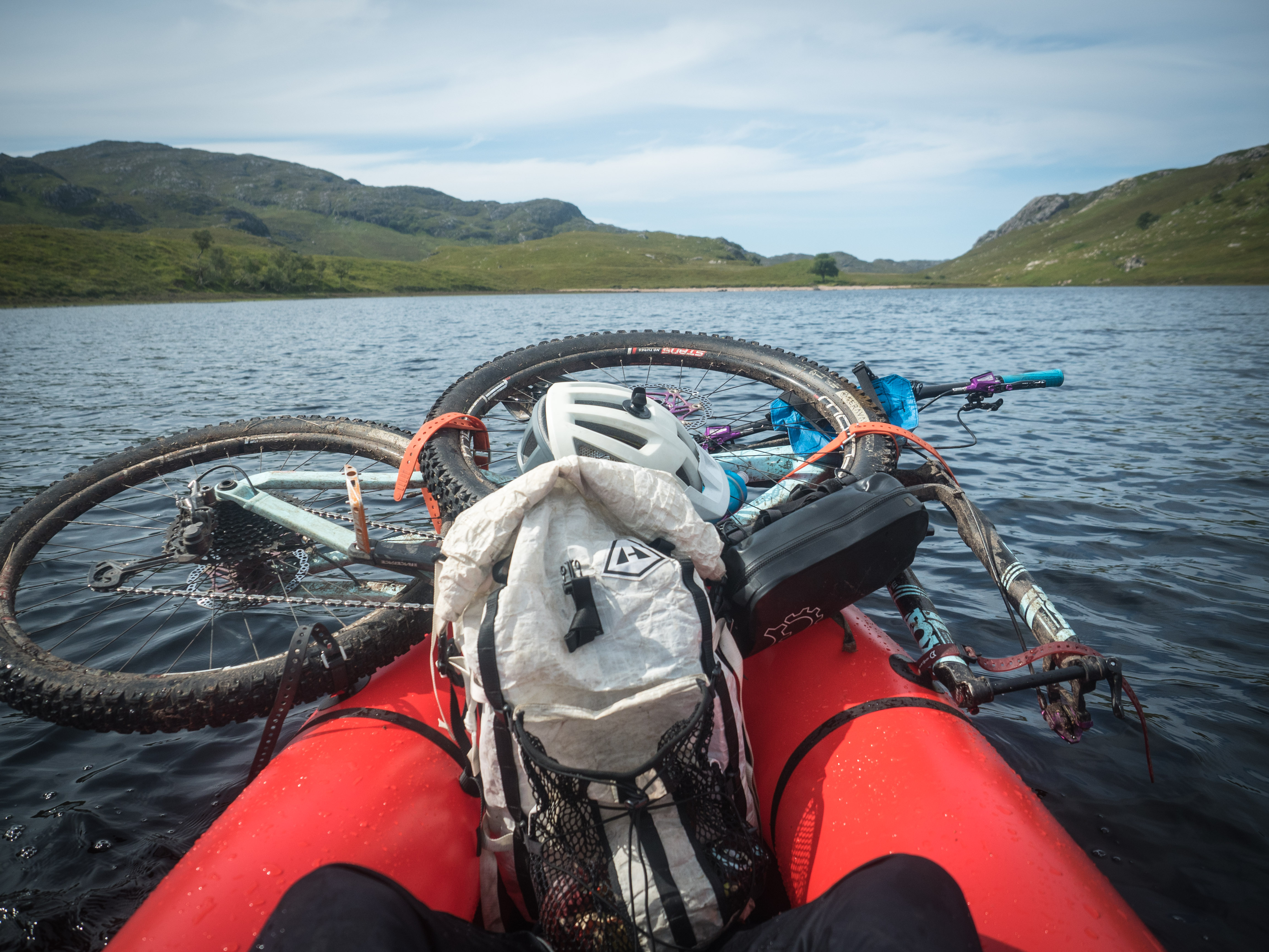 Travel is never easy, and although every kilometre of travel feels like it contains two kilometre’s worth of things to see, we also get nowhere fast. Headwinds on the water and rough terrain on the land conspire to make it a slow day of travel, so there’s nothing to do but ease off and appreciate it. We end up at the far end of the loch, where we once had a pretty unique rendez-vous with Steve Fassbinder and Lizzy Scully on their Scottish tour: us waiting in a tent in the rain and them paddling towards us out of the mist, riding a booming tailwind across the water. Today it’s a blazing sun and a summer breeze, almost too warm (for us, anyway) that reminds me of yet another time, riding through this section late on a similarly sunny day on the Highland Trail 550, seeing the setting sun reflected on the dark water of the loch.