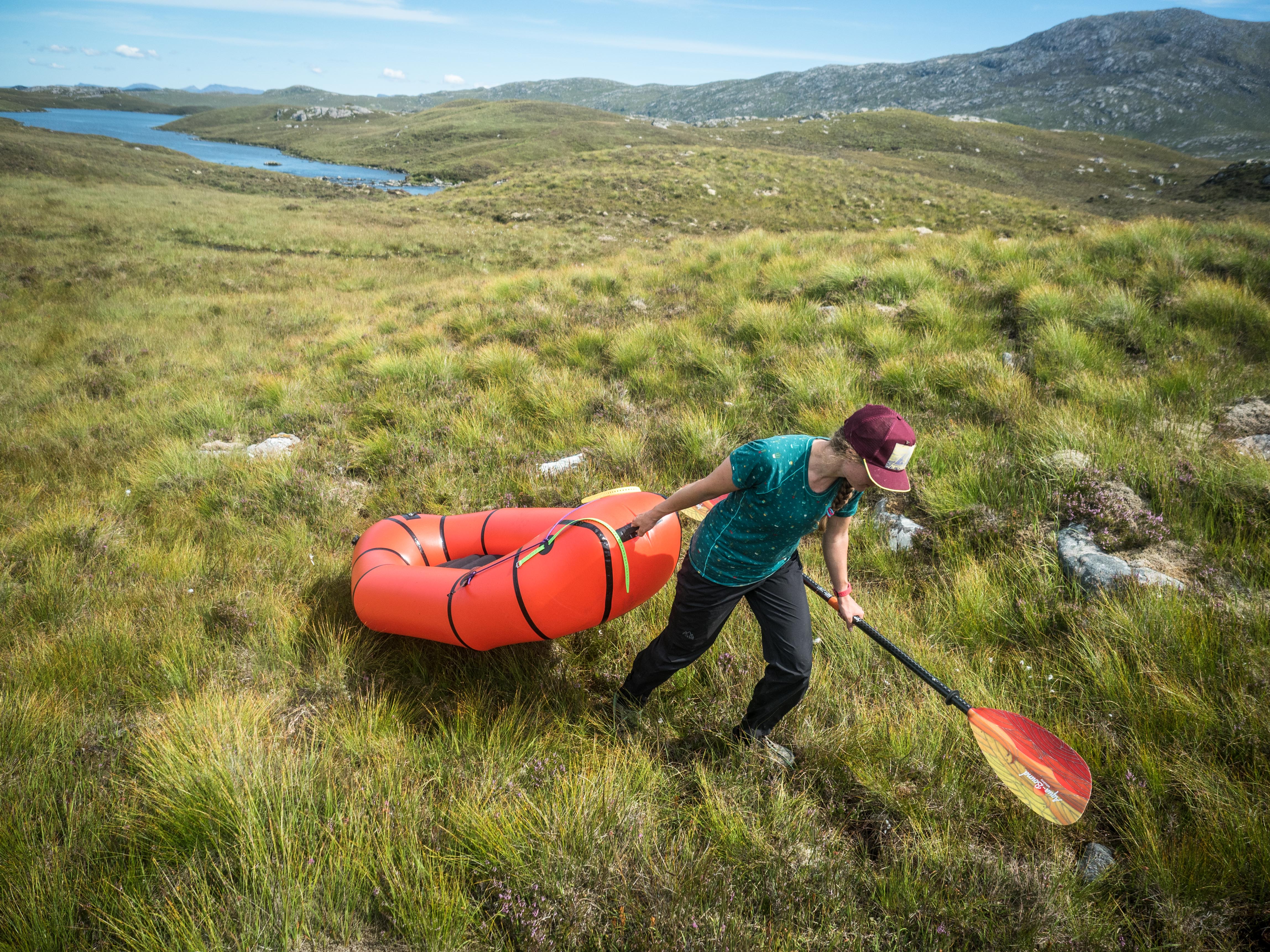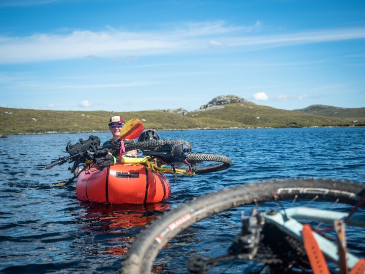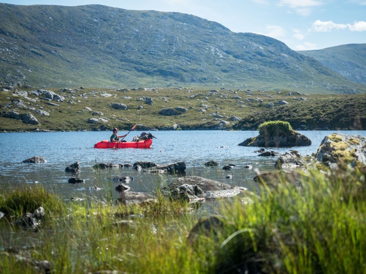 Many of the access tracks into Fisherfield, ours included, are to service the game fishing industry, and so all roads lead to water, in a way. Ducking and diving through the cnoc and lochain post-glacial landscape of small lochs and craggy knolls, the road and few houses are quickly out of sight and quiet reigns, apart from the whine of summer insects and the cries of meadow pipits in the ripening grasses. Before too long, the track ends abruptly at the peat-stained waters of a large, complex loch — Fionn Loch — and we inflate the boats, pack the bikes and put on. The map never quite tells the full story in these parts though, and it soon turns out that we’re in a separate, smaller loch that’s separated from the main body by a small rapid, and it’s time for a quick portage across the moor. Even the dry parts of the north-west are mostly water, and without warning I find myself waist-deep in a lurking bog.