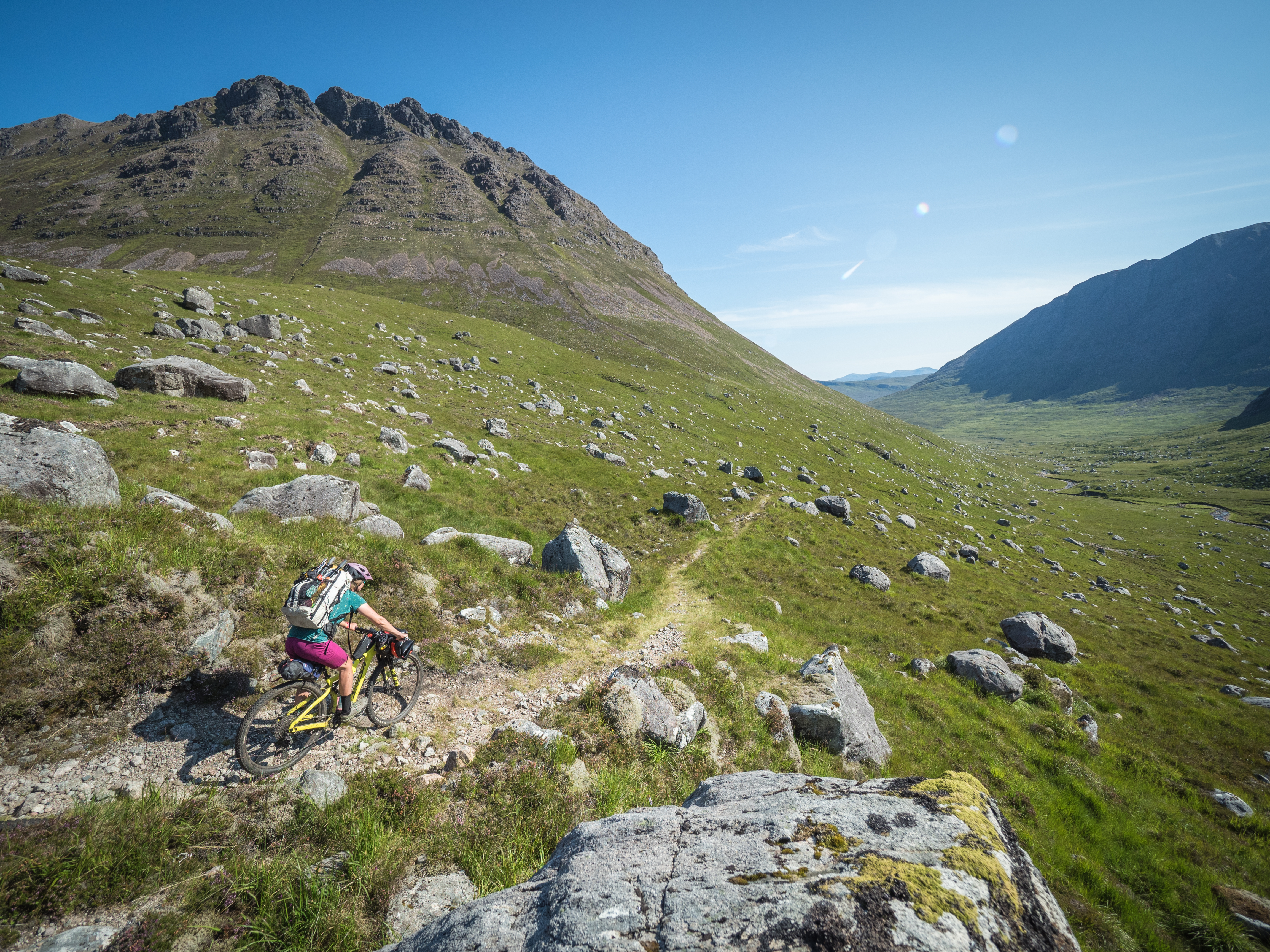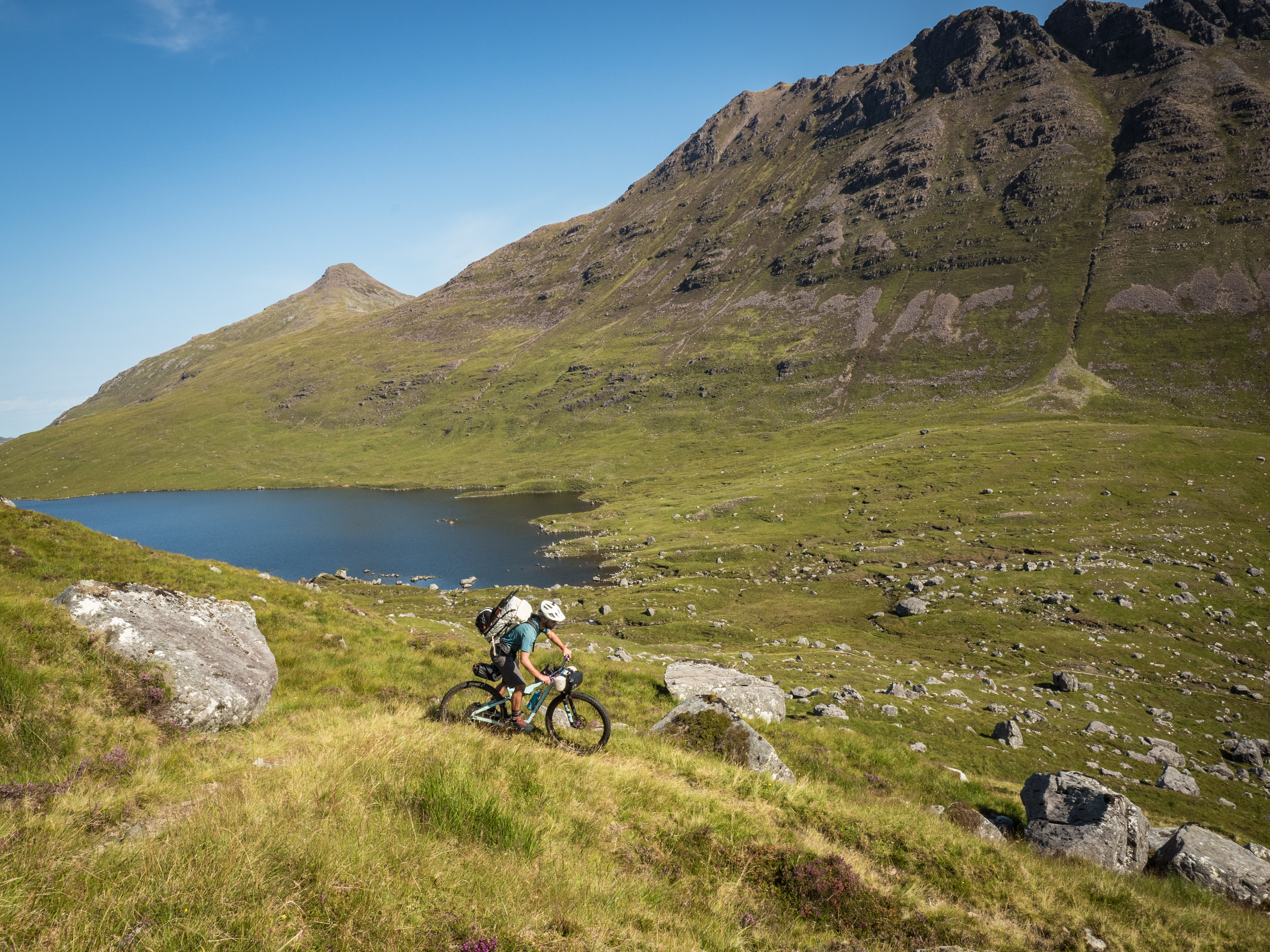 The morning takes place in a flurry of midge-induced rage, as every insect in Wester Ross seems to have found out where we are. The trail down towards Loch na Sealga is a classic, but one that I’ve never actually ridden in this direction. It’s a morning of new views, new impressions and new memories. Once down on the water, the boats prepare to take us to yet more new corners of the map. The headwind of yesterday has died away, but instead of a windless afternoon it’s been replaced by a stiff sea breeze off the coast in front of us in the heat of the day. One to chalk up to bad planning I think! We paddle past the faint traces of old crofts, towards the end of the loch and the start of another fishing track. I spend a lot of the paddling time looking up at the familiar sides of An Teallach, and seeing new waterfalls and pockets of old forest that I’ve never been able to see before from the ‘normal’ route.
